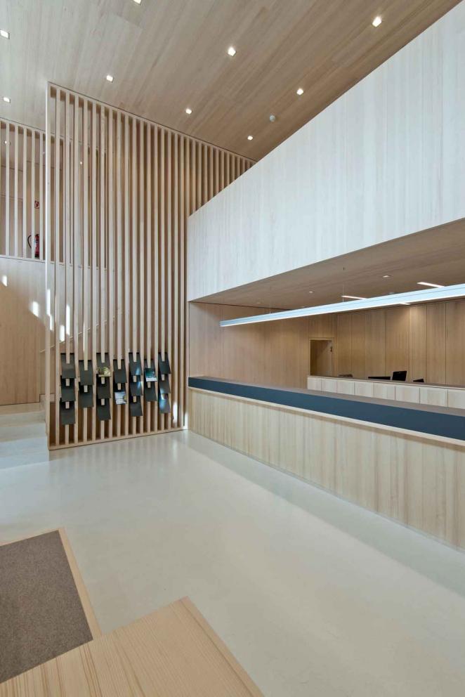 Kunta asetti hankkeen toteuttamisen tavoitteeksi Wallingerin mukaan massiivipuisen rakennuksen lattiasta kattoon. Hanke toteutuikin jalokuusesta valmistetuista massiivipuuelementeistä. -Rakennuksen lattia, paneelit ja akustiikkakatto ovat kaikki kuusesta, minkä seurauksena talossa on erinomainen akustiikka. Hankimme samalta arkkitehdiltä myös rakennuksen sisustussuunnittelun, mikä työllisti paikallisia puuseppiä ja yrityksiä.