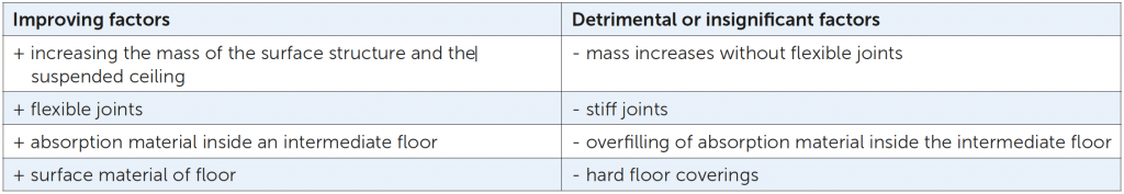 Table 1. The most significant factors affecting the impact sound insulation of wood intermediate floors, as well as factors that were found to have no effect or a detrimental effect on impact sound insulation.