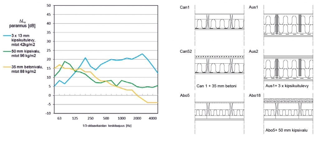 Kuvan 1 kuvaajassa on esitetty välipohjan kansilevyn päälle suoraan asennettujen levy- ja valukerrosten vaikutus askelääneneristävyyteen. Massalisäyksen parannusvaikutus on huomattava erityisesti pienillä taajuuksilla.