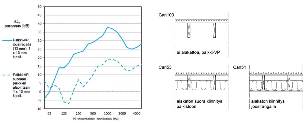 Välipohjan pintaan kohdistuva askelheräte etenee rakenteen läpi sekä runko- että ilmaäänenä [17-19]. Koska rakenteita pitkin etenevä runkoääni on erityisen merkittävä äänenkulkureitti, puuvälipohjan askelääneneristävyys perustuu suurelta osin rakennekerrosten liitoksissa tapahtuviin energiahäviöihin [12, 20, 21]. Kirjallisuustutkimuksen perusteella alakaton liitos kantavaan palkistoon ja pintalaatan liitos kansilevyyn ovat merkittävimpiä liitoksia puuvälipohjissa [8]. Kuvan 2 kuvaajassa on esitetty eri alakattotyyppien parannusvaikutus palkkivälipohjalla.
