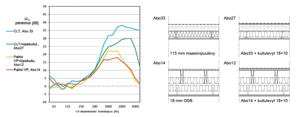 Lattianpäällyste vaimentaa lattian pintaan kohdistuvaa iskua ja samalla koko rakenteeseen siirtyvää askelääniherätettä [22]. Lattiapäällysteiden askelääneneristävyyden parannusvaikutus on vahvasti riippuvainen tarkastelutaajuudesta ja siitä, millaisen välipohjan päälle lattianpäällyste asennetaan [23]. Raskaalla betonilaatalla mitattuja lattianpäällysteen parannusarvoja ei voida käyttää suoraan arvioitaessa parannusvaikutusta puuvälipohjilla. Myös kevytrakenteisissa välipohjissa on eroja. Sama lattiapäällyste paksun CLT-levyn tai ohuen lattiakipsilevyn päällä tuottaa erilaisen parannusvaikutuksen [8, 15]. Yleisesti käytössä olevien lattianpäällysteiden parannusvaikutus puuvälipohjilla alkaa noin 250 Hz taajuudelta [17, 24, 25]. Tampereen teknillisessä yliopistossa on tutkittu lattiapäällysteiden vaikutusta askelääneneristävyyteen sekä puu- että betonivälipohjilla. [4, 23] Kuvan 3 kuvaajassa on esitetty erään vinyylilattiapäällysteen askelääneneristävyyden parannusvaikutus, kun se on asennettu erilaisten puuvälipohjien päälle. Alusrakenne vaikuttaa parannusvaikutukseen erityisesti yli 500 Hz taajuuksilla.