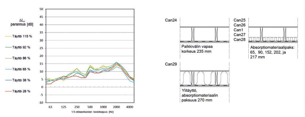 Palkkirakenteisilla välipohjilla ohutkin absorptiomateriaalikerros välipohjan sisällä parantaa askelääneneristävyyttä huomattavasti [8]. Absorptiomateriaali vaimentaa välipohjan sisällä etenevää ilmaääntä ja vaimentaa ilmatilaan syntyviä seisovia ääniaaltoja. Välipohjan sisään jäävän ilmatila ylitäytöllä ei ole havaittu olevan askelääneneristystä parantavaa vaikutusta [8, 17]. Absorptiomateriaalin parannusvaikutus havaitaan myös CLT-välipohjilla, joissa on levyrakenteinen alaslaskettu alakatto. Alakaton yläpuolisessa ilmatilassa absorptiomateriaali vaimentaa ilmatilan äänikenttää. Kuvan 4 kuvaajassa on esitetty vertailu eri absorptiomateriaalipaksuuksien vaikutuksesta välipohjan askelääneneristävyyteen. Suhteellisesti suurin parannus saavutetaan, kun täysin tyhjään ilmatilaan lisätään ohut absorptiomateriaalikerros.