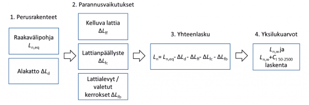 Puuvälipohjien askelääneneristävyyden laskentaan ei ole ollut saatavissa validoituja ja suunnittelutyöhön soveltuvia laskentamenetelmiä tai -ohjelmistoja. [8] A-Insinöörien akustiikkasuunnitteluyksikössä on luotu suunnittelutyöhön ja tuotekehitykseen soveltuva askelääneneristävyyden laskentamenetelmä. Menetelmä perustuu laajaan kirjallisuustutkimukseen puuvälipohjien parametrisistä askelääneneristävyysmittauksista [8] sekä A-Insinöörien akustiikkasuunnitteluyksikön tutkimus- ja kehitystyöhön. Laskentamalli ja sen validoinnin tulokset on esitetty aikaisemmin kansainvälisessä Baltic-Nordic Acoustic Meeting 2018 konferenssissa Islannissa keväällä 2018 sekä tulevassa Rakennusfysiikka 2019-seminaarissa Tampereella [9, 10]. Validointi tehtiin vertailemalla laskentamenetelmällä määritettyjä askeläänitasoja Ln sekä askeläänitasolukuja Ln,w ja L´n,w+ CI,50-2500 vastaavien rakenteiden mittaustuloksiin. Vertailussa oli mukana laboratoriossa ja asuinrakennuksissa mitattuja välipohjarakenteita, yhteensä 28 rakennetta. Laskentamallin laskennan vaiheet on esitetty kuvan 5 vuokaaviossa. Vaiheissa 1-3 tulokset lasketaan 1/3-oktaavikaistoittain 50-5000 Hz taajuusalueella.
