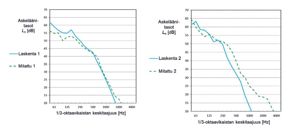 Ensimmäisessä vaiheessa lasketaan raakavälipohjan askeläänitasot Ln ja alakaton parannusvaikutus ΔLd. Raakavälipohjalla tarkoitetaan tässä tapauksessa joko kantavaa palkistoa ja niihin kiinnitettyä kansilevyä tai kantavaa massiivipuulevyä, kuten CLT. Toisessa vaiheessa arvioidaan mahdollisen kelluvan laatan ΔLff, raakavälipohjan yläpuolisten levykerrosten ΔLfb ja lattianpäällysteen ΔLfc parannusvaikutus askeläänitasoihin. Parannusvaikutukset voidaan arvioida joko laskennallisesti tai mittausdatan avulla [9,10]. Kansilevyn päälle asennettujen levykerrosten parannusvaikutukset yhdistetään raakavälipohjan laskennalliseen askeläänitasolukuun W. Scholl et al. mukaisesti [26, 27]. 1/3-oktaavikaistoittain lasketuista askeläänitasoista Ln voidaan määrittää yksilukuarvot Ln,w ja Ln,w + CI,50-2500 [28]. Kuvan 6 kuvaajissa on esitetty kahden välipohjan mitatut ja laskennalliset askeläänitasot 1/3-oktaavikaistoittain.