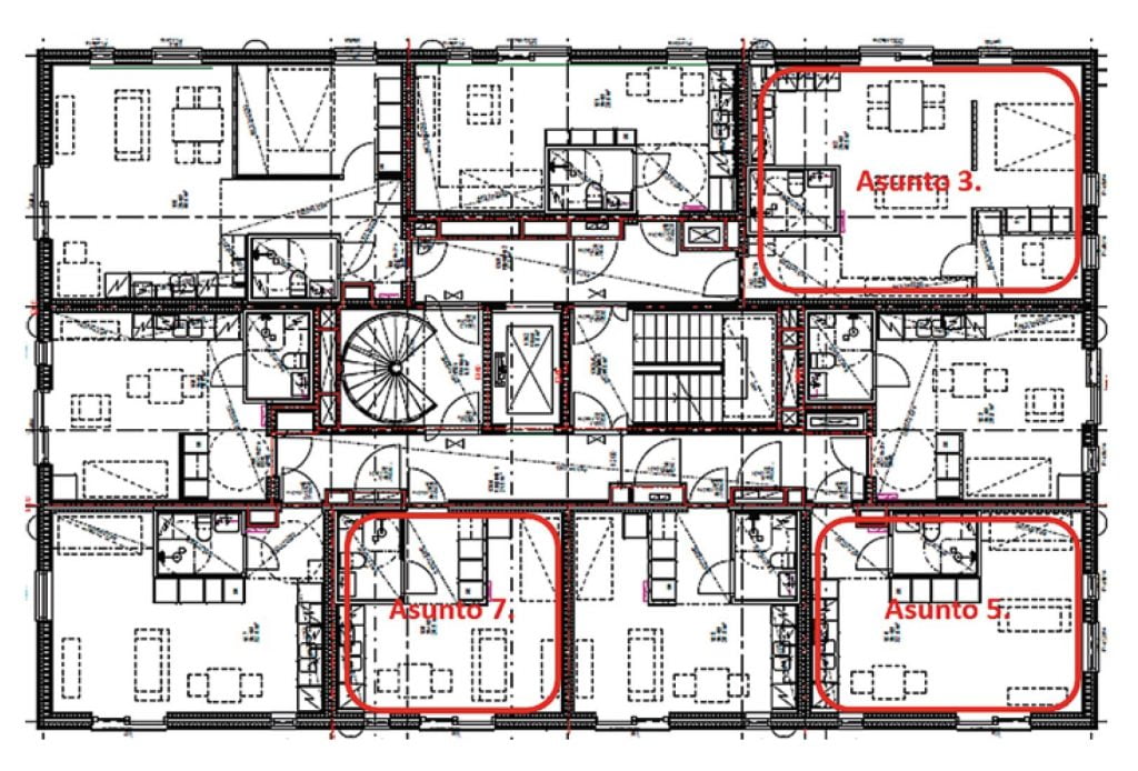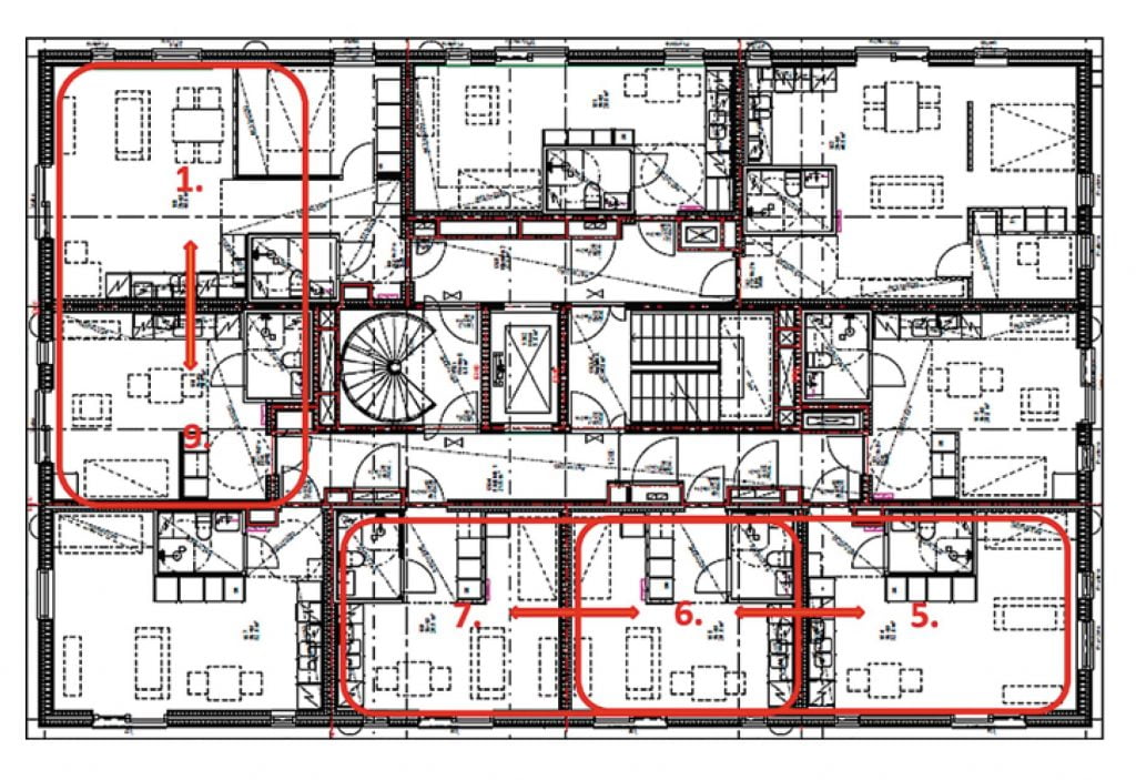 Ilmaääneneristävyyden mittaukset suoritettiin ensimmäisen kerroksen huoneistoissa siten, että ääneneristävyyden arvo määritettiin kolmen huoneistojen välisen seinän osalta. Kuvassa 4 on esitetty, miten huoneistot ja huoneistojen väliset seinät sijaitsevat rakennuksessa.