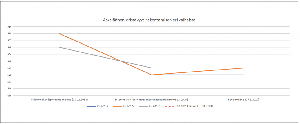 Ensimmäisten mittausten aikana välipohjarakenteena oli betoni (kelluva laatta), askeläänieriste ja CLT. Seuraavissa mittaustilanteissa välipohjarakenteeseen lisättiin vinyylilankku ja alapuolisen asunnon kattoon koolaus, eriste, jousiranka sekä kipsilevytys. Askeläänen eristävyys parantui huomattavasti kaikissa huoneistoissa rakentamisen edetessä (kuvaaja 1).