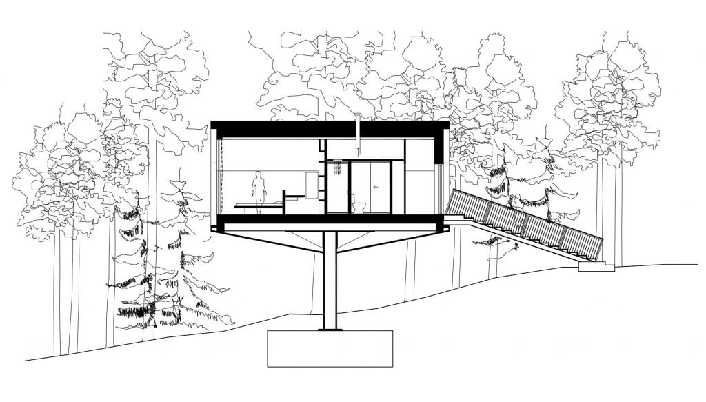 ”Paikan päällä huomio kiinnittyy ensimmäisenä metsämaisemaan. Kaukaa lähestyttäessä aitta sulautuu värityksensä ansiosta taustaansa ja puiden välissä leijuva talo pääsee hieman yllättämään. Maan tasossa kulkiessa rakennus ei ole maiseman edessä ja ympäristöä pystyy havainnoimaan esteettä”, osakas Mikko Jakonen huomauttaa.