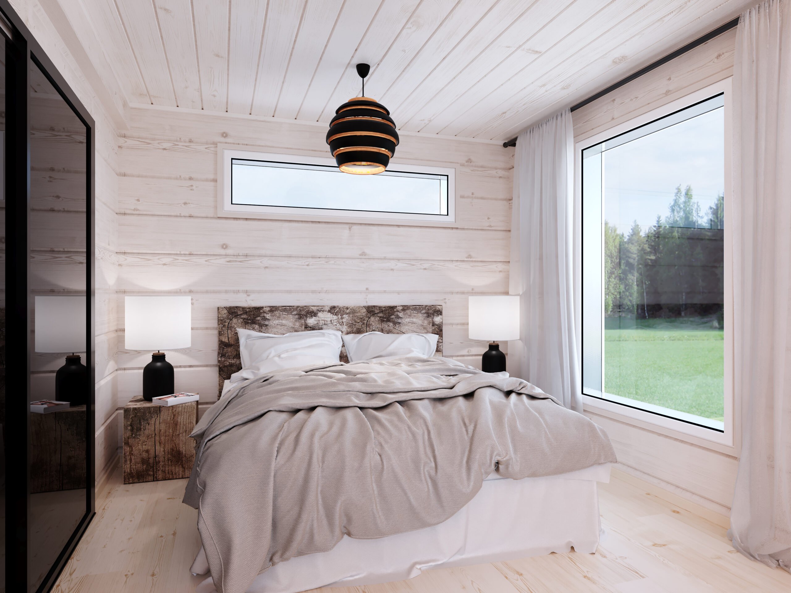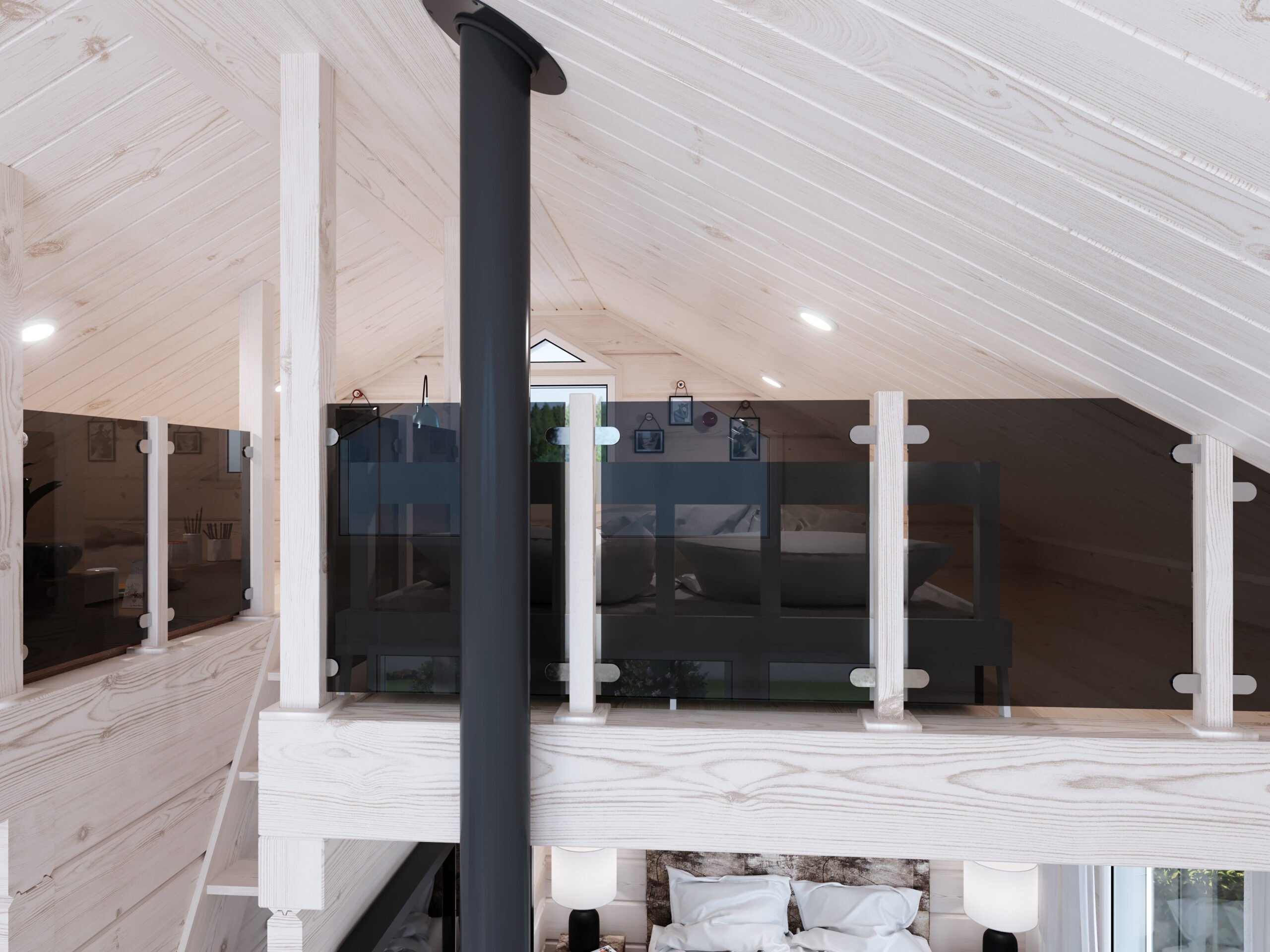 Keittiössä ja olohuoneessa luonto tulee osaksi sisustusta lattiaan saakka ulottuvista isoista ikkunoista. Myös makuualkovissa on iso ikkuna. Asuintilojen seinät ovat vaaleaa hirsipaneelia ja keittiötasot graniittia. Makuutilat sijoittuvat pääasiallisesti parvelle. Olohuoneen yhteydessä olevan tilan voi myös sisustaa makuualkoviksi. Kaikissa loma-asunnoissa on kamiina. Kylpytiloissa on sähkölattialämmitys ja asuintiloissa ilmalämpöpumppu sekä sähköpatteri.