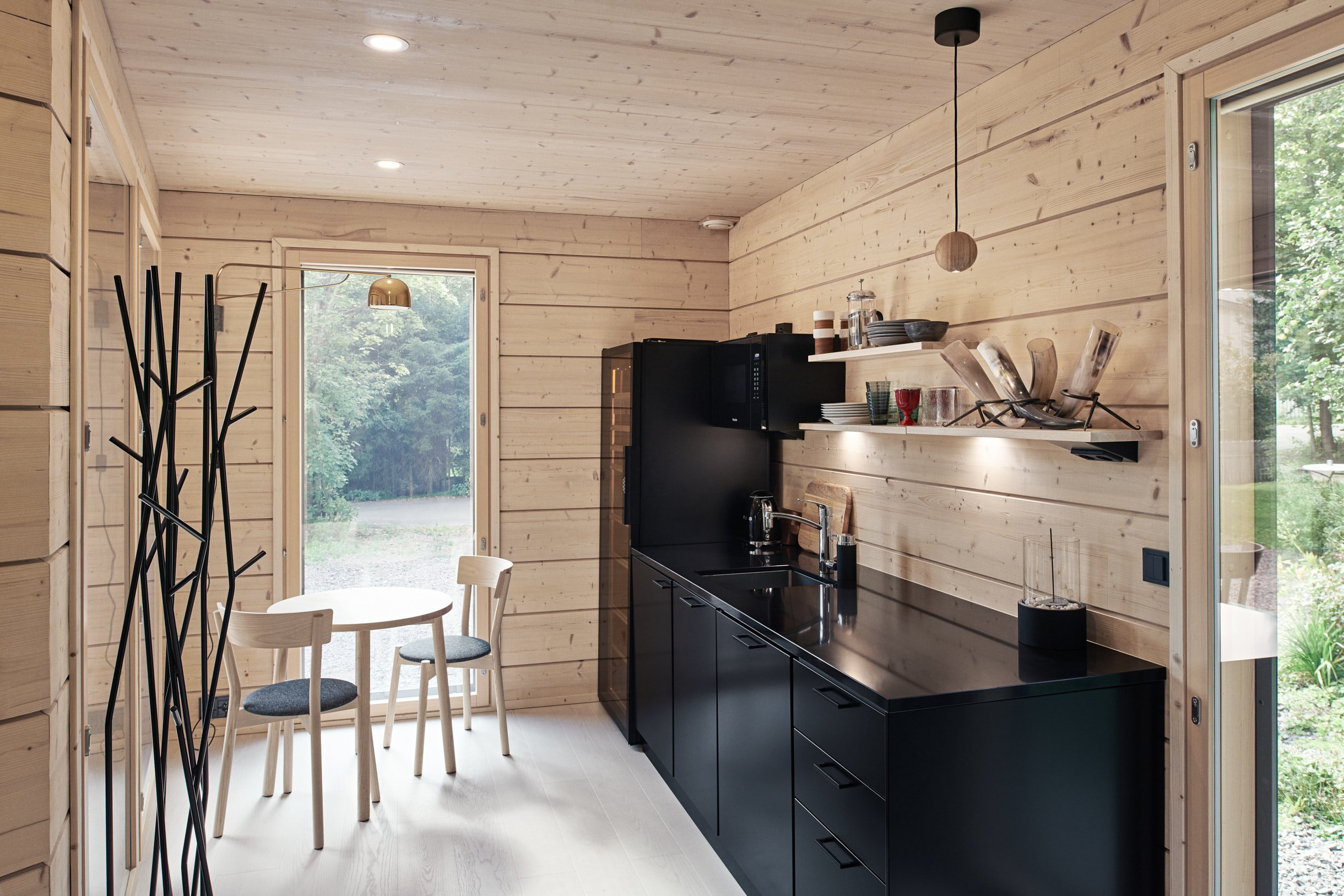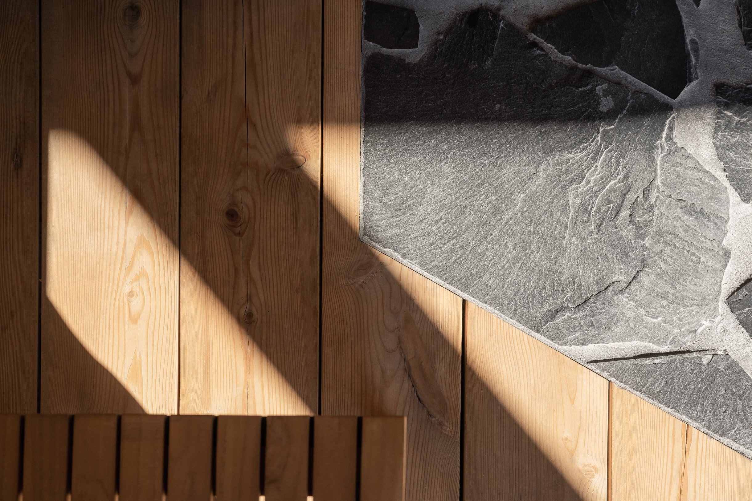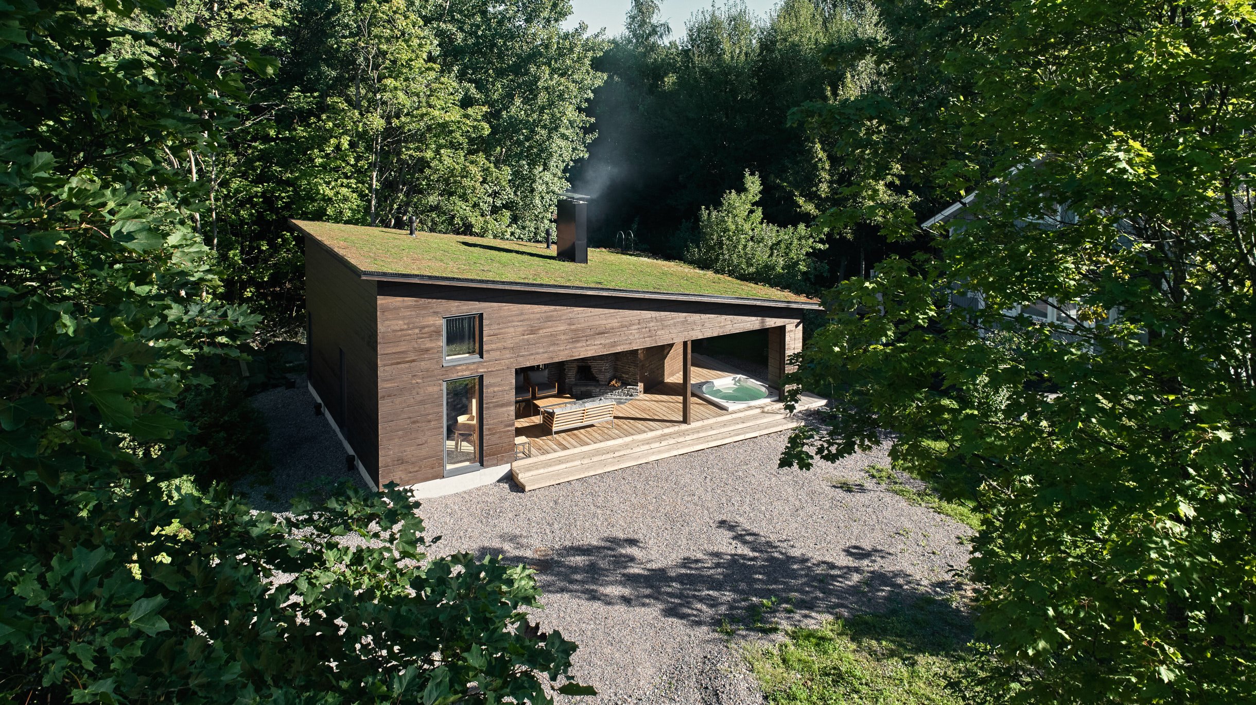 Ulkoseinät rakennettiin 270 mm paksusta massiivilamellihirrestä. Ulkoterassin avotakka muurattiin liuskekivestä, ja myös sisätiloissa käytettiin puun lisäksi liuskekiveä. Katettu terassi porealtaineen ja takkoineen on mitoitettu suuremmankin seurueen oleskeluun. Muurari työsti kaikki liuskekivimuuraukset työmaalla yhden kesän aikana. Suomalaisesta metsästä muistuttava tunnelma välittyy esimerkiksi katon ja parvikerroksen vaaleasävyisten puurimoitusaiheiden kautta. Akustinen rimakatto työstettiin valmiiksi elementeiksi puusepänverstaalla, ja elementtiasennus tehtiin työmaalla. Parven puurimakaiteet ja portaat puuseppä työsti työmaalla.