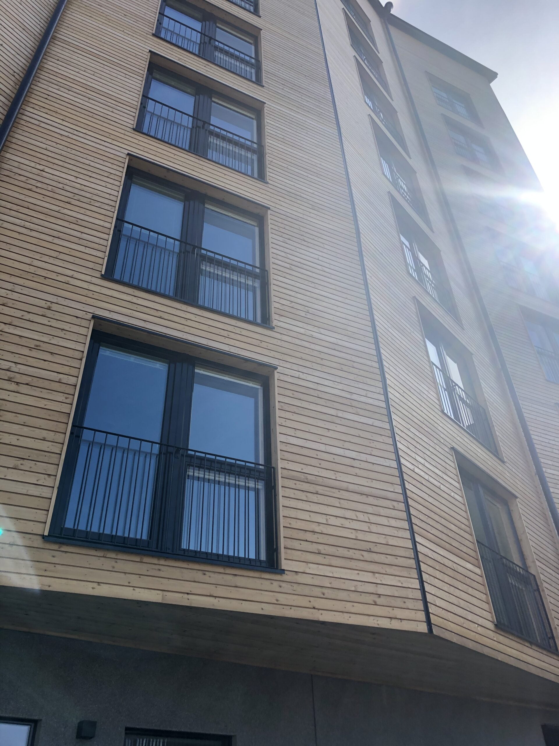 Julkisivuverhoiluksi valikoitunut käsittelemätön höylätty lehtikuusi korostaa rakennuksen kappalemaisuutta, ja rauhallinen toistuva ikkunasommittelu luo pintaan tekstuurimaisen vaikutelman. Suorailmeinen vaakaverhous häivyttää julkisivuista CLT-elementtien vaakasaumat. Pystysaumoihin tuotiin perinteisestä puurakentamisesta poiketen uudenlaista detaljiikkaa, ja nurkkalaudat korvattiin metallisilla hattulistoilla. Ulkoarkkitehtuurissa on pitäydytty vain muutamassa kantavassa aiheessa, ja tässä paikassa se riittää. Taitteisella julkisivumuodolla on mahdollistettu vaihtelevuutta asuntojen näkymiin ja luotu rakennukselle omaleimainen tunnistettava hahmo. Yhteen suuntaan kallistuva lapekatto kätkee sisäänsä iv-konehuoneen. Puukerrokset sijoittuvat ulokkeina betonisen jalustakerroksen päälle. Tämä on ollut helposti toteutettavissa CLT-moduulitekniikkaa hyödyntäen.