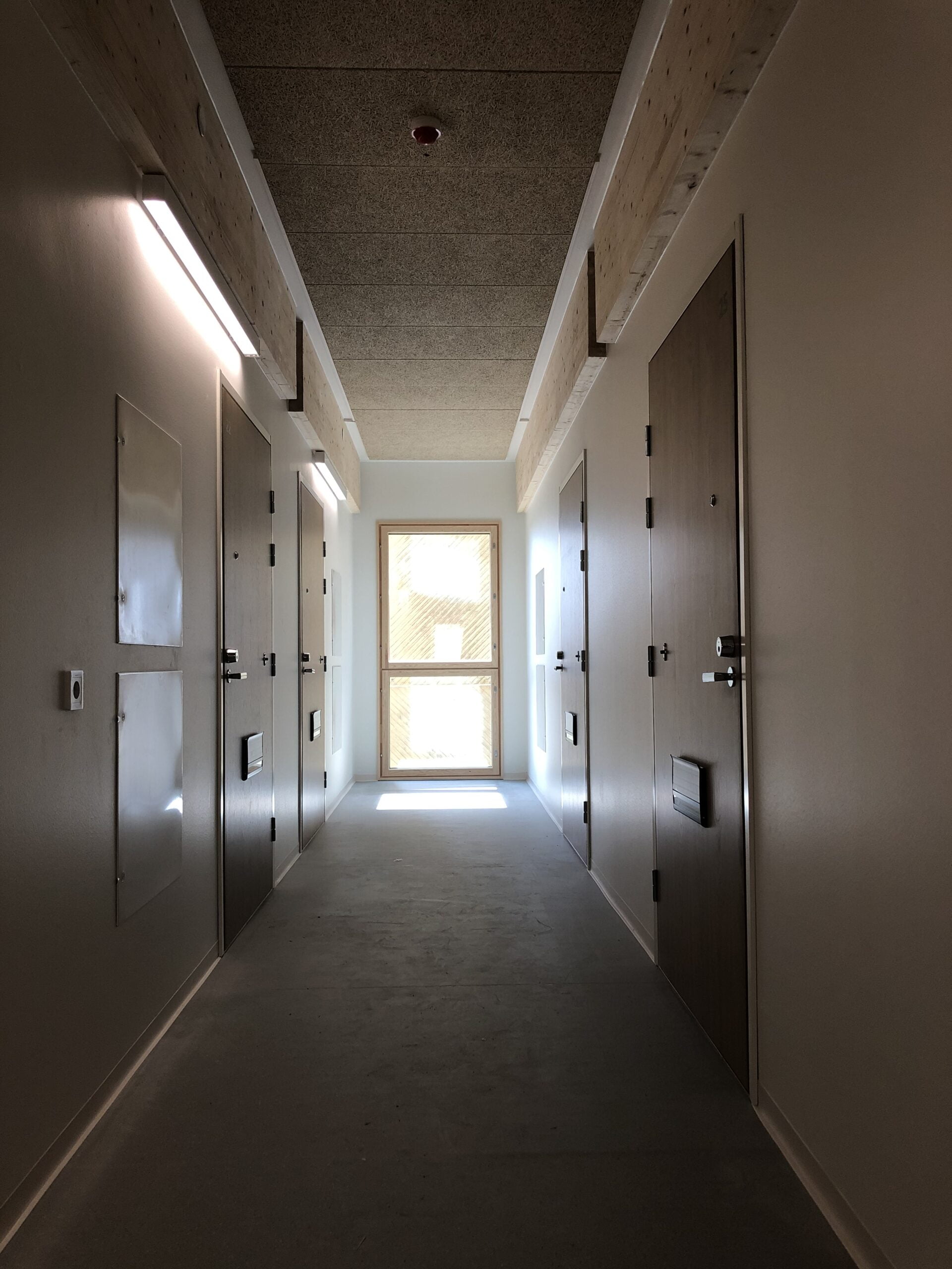Sisäpuolella pintamateriaalien valintaan vaikuttivat palotekniset ja akustiset vaatimukset sekä pitkäaikaiskestävyys. Kaikki mahdolliset puupinnat haluttiin kuitenkin jättää näkyviin. Asunnoissa CLT-kattopinnat käsiteltiin kuultavalla palonsuoja- aineella. Puualumiini-ikkunoiden ja ranskalaisten parvekkeiden sisäpuitteet käsiteltiin kirkkaalla lakalla. Käytävillä ja porrashuoneissa puuosista näkyviin jäivät asuntomoduulien CLT-kannatuskonsolit, CLT-hissikuilut ja portaiden alapinnat. Nämä pinnat puunsuojakäsiteltiin.