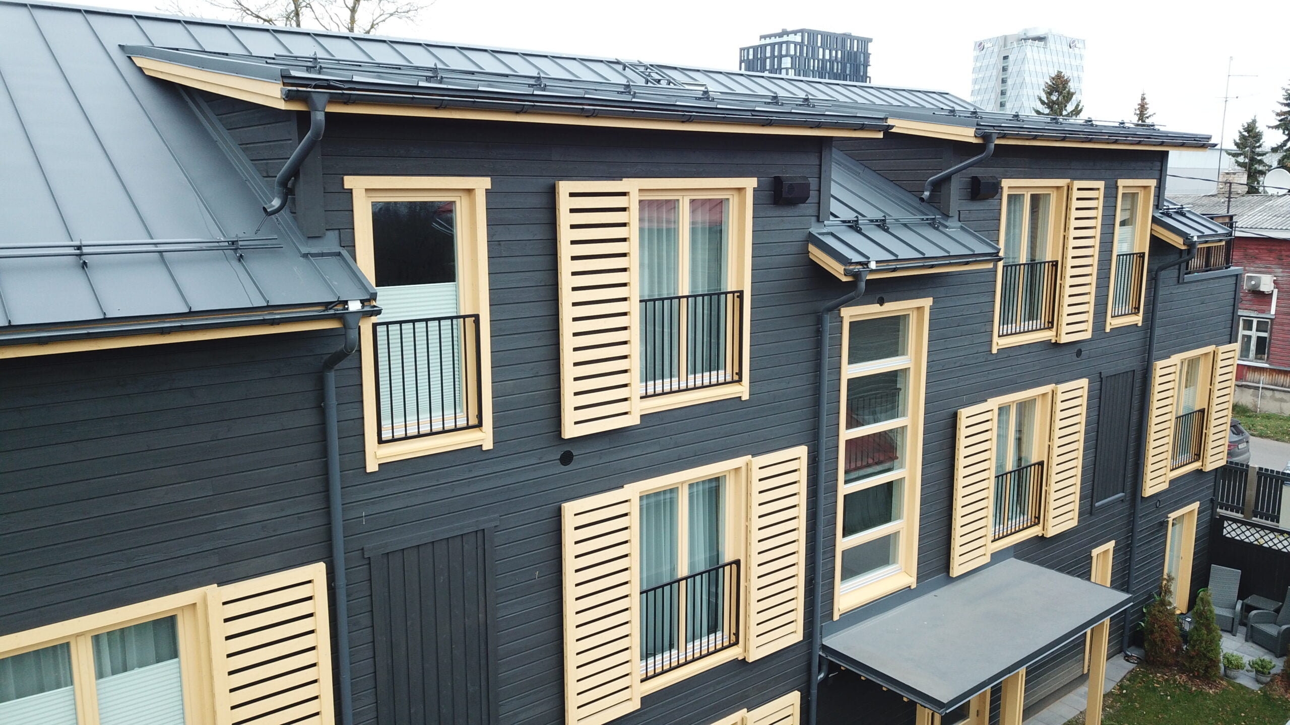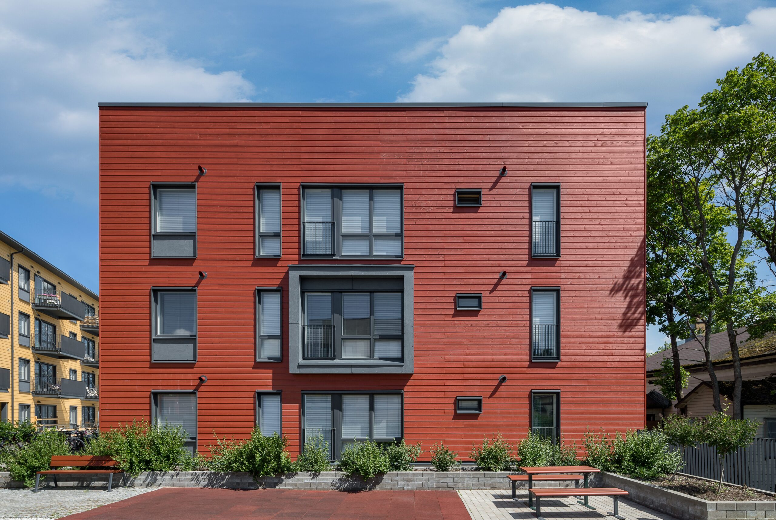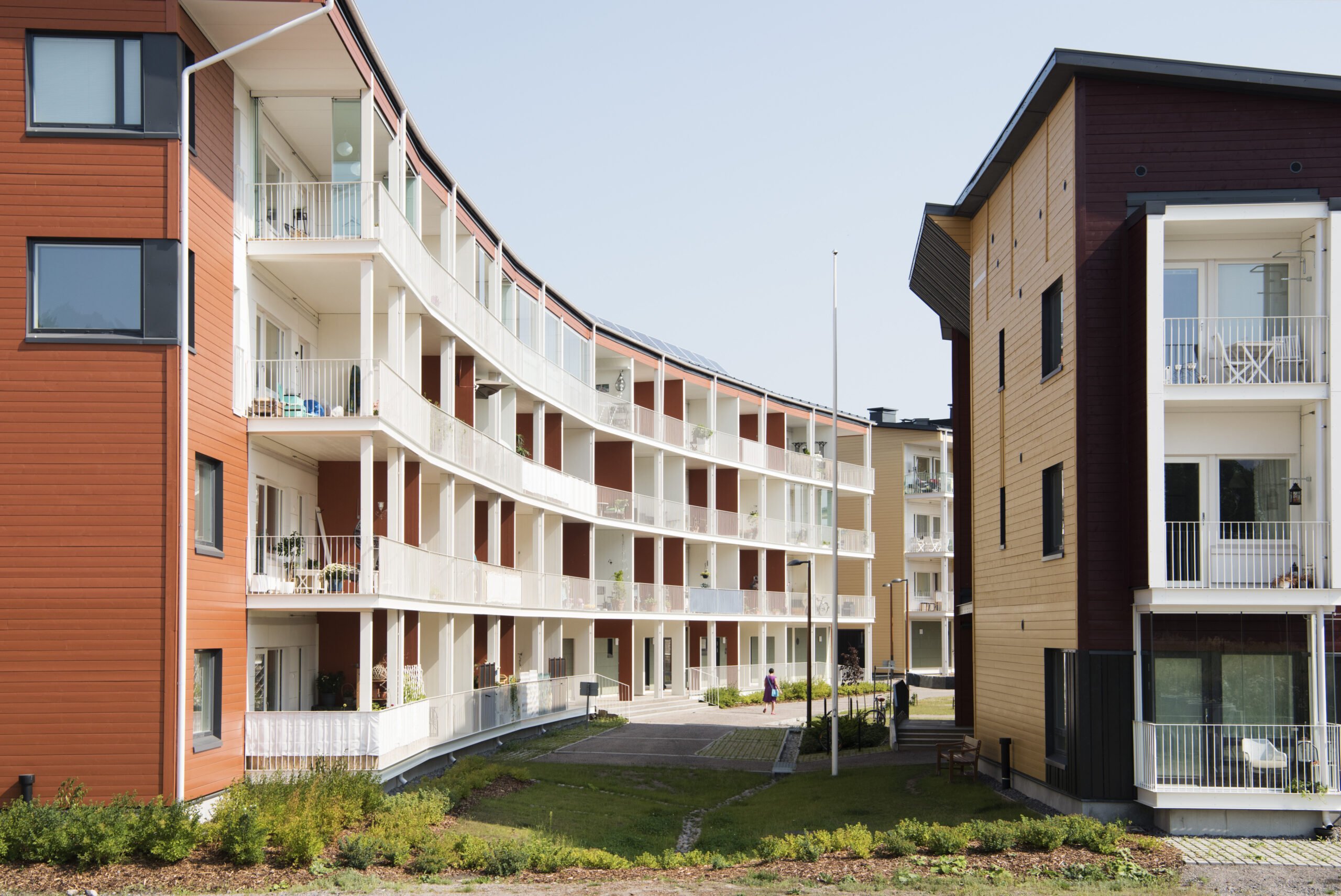 − Puujulkisivussa, kuten hirsi- tai lautaverhouksessa, voi nähdä puun ominaiset pintarakenteet. Puupinta on inhimillistä ja kosketeltavaa. Pihapiiriin puu tuo rikkautta ja kokonaisvaltaisuutta, sanoo Norvasuo. Samannäköisiksi rakentuneisiin lähiöihin puurakennukset voivat tuoda uusia, mielenkiintoisia kontrasteja.