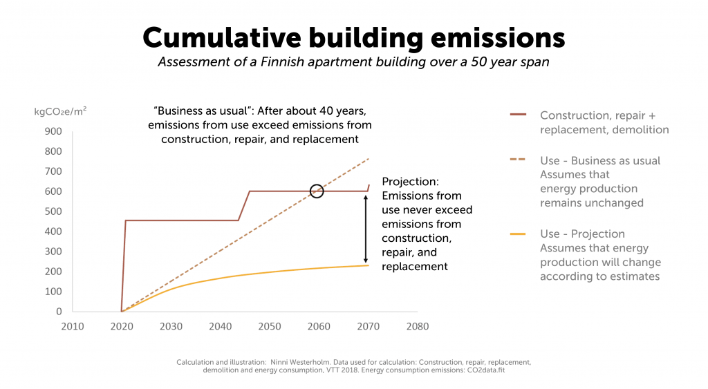 The figure below illustrates when and where emissions are generated for a traditional Finnish apartment building. The red line in the figure represents emissions generated by construction, repair, replacement, and demolition. The orange dashed line shows cumulative emissions from use assuming that energy production remains unchanged. The yellow line illustrates a more likely, forecast-based estimate of emissions from use.