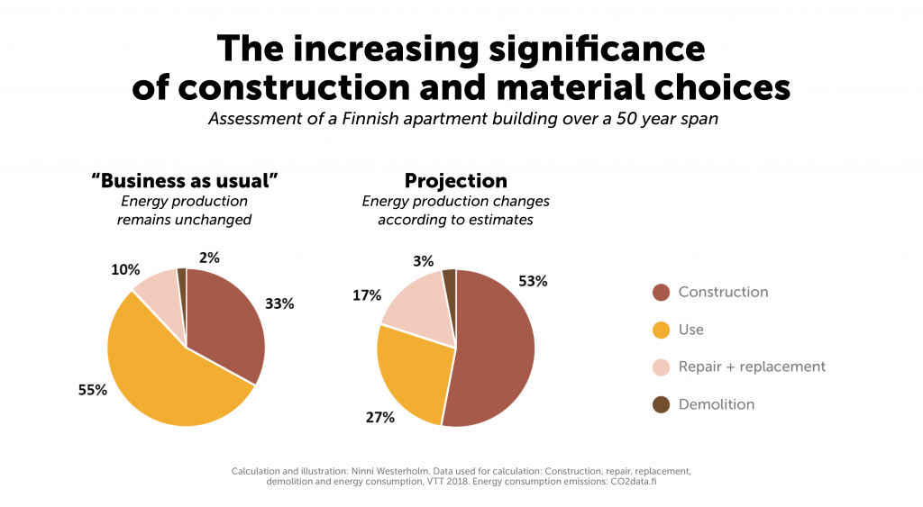 Advocates of sustainable construction have long emphasised how important energy efficiency is in new construction and how emissions during the building’s actual use are higher than during construction. The latter is only true, however, if energy production is assumed to remain the same during the building’s use. But this is not a likely scenario. The energy industry is becoming more and more low-carbon whereas construction emissions cannot be reduced once construction is over. Waste levels from construction and its material choices are also far higher than from building use.