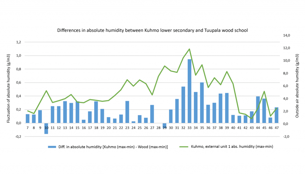 The monitoring period included a total of 41 weekends. The difference between the highest and lowest humidity was smaller in the wooden school than in the stone school on 39 of those weekends (Figure 1). On average, the difference was 0.24 g/m3. The ventilation systems use different heat recovery mechanisms. The wooden school uses rotating cells, and the lower secondary school has liquid circulation (glycol circulates between the cells in separate inlet and outlet channels). Moisture can condense on the surface of rotating cells under certain conditions, and a small portion of the outgoing air returns as the cell rotates, which may slightly even out fluctuations in humidity.