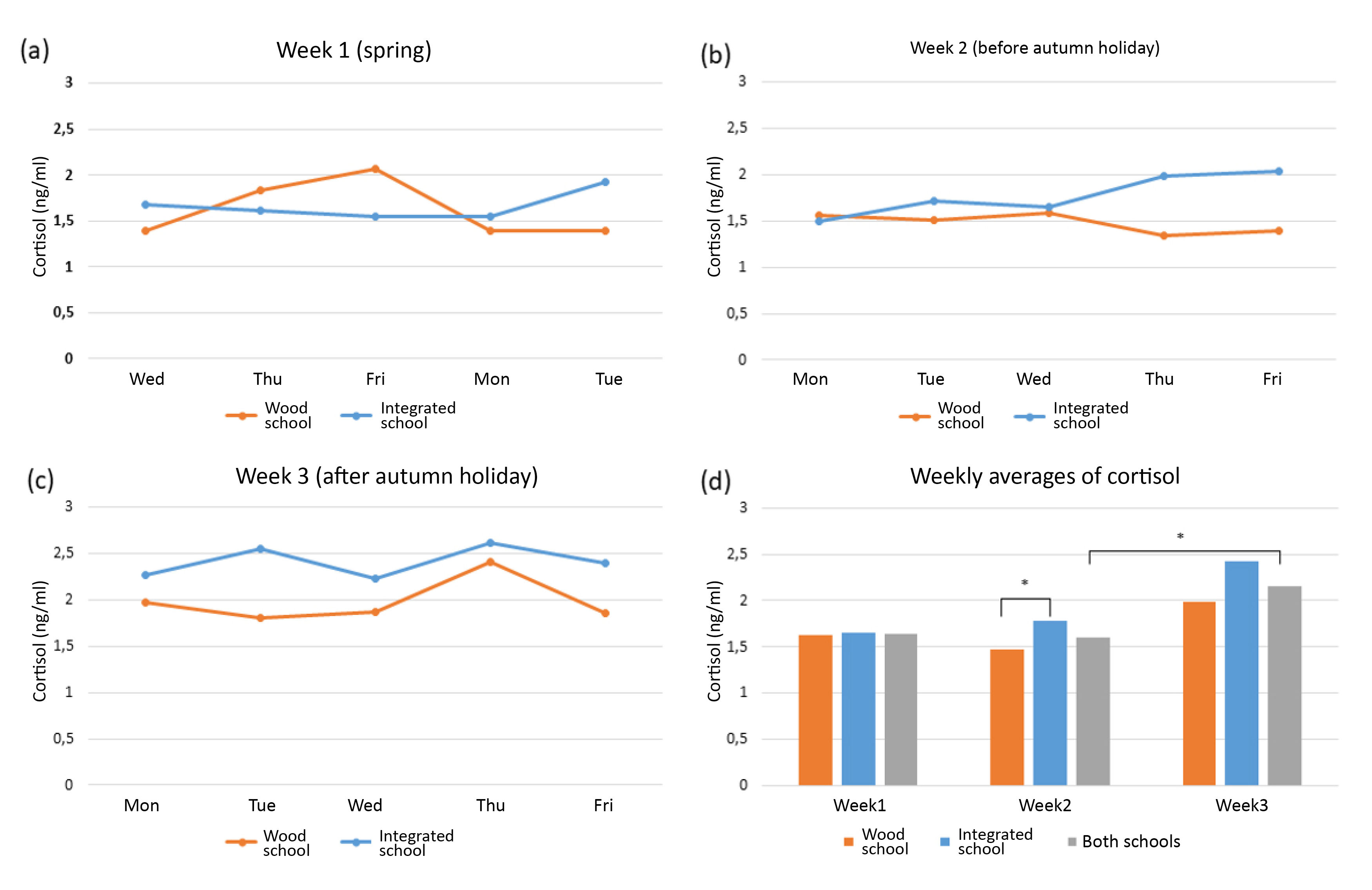 There was a statistically significant difference between the cortisol levels of the students in the Tuupala wood school and those of the Vaala integrated school during the week before the autumn holidays (p <0.05, Figure 2). The statistically significant difference may stem from the timing: the extreme stress spikes that might cause abnormal results were at a minimum. In other words, the conditions more closely reflected an ordinary school day and its environment. It is worth noting that a similar difference was detected more or less across the entire monitoring period, although it was not statistically significant.