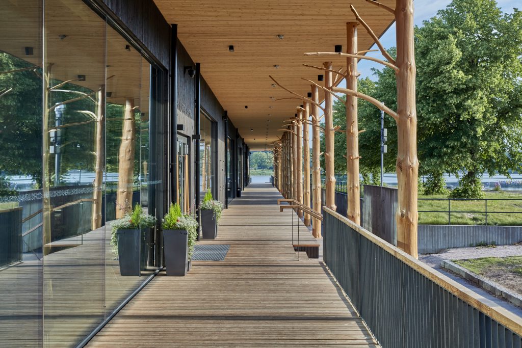 Sisäänkäyntikatos on jo ulkoa saavuttaessa vaikuttava ilmestys. Rakennuksen arkkitehtuurin toiminnallinen puoli on hoidettu painotetusti maantasossa, kun taas puinen alakatto paitsi rajaa tilaa, on kokonaisuuden vahvin ja tunnistettavin visuaalinen elementti. Painovoimaa uhmaavalta vaikuttavan vapaamuotoisen, paikoin paksun katon muoto näyttää syntyvän puulevyjä päällekkäin latomalla. Leijuvan vaikutelman mahdollistavat kantavat pilarit ovat lasiseinän takana, joka leikkautuu katon puiseen alapintaan hienostuneesti ja viimeistellysti.