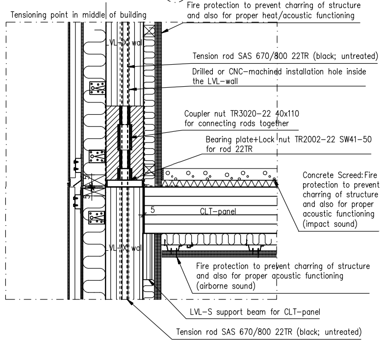 Käytetyn järjestelmän kehitys onkin lähtöisin maanjäristysalueiden tarpeesta vahvistaa betonirakennuksia, mutta järjestelmää on sittemmin sovellettu ja kehitetty myös puurakennuksille [2]. Lighthouse Joensuussa käytetty jälkijännitysjärjestelmä perustuu PressLam- ja Simpson Strong-Tie Strong Rod -järjestelmiin [3, 4]. Tarkempi kuvaus käytetystä jälkijännitysjärjestelmästä on luettavissa erillisestä julkaisusta [5].