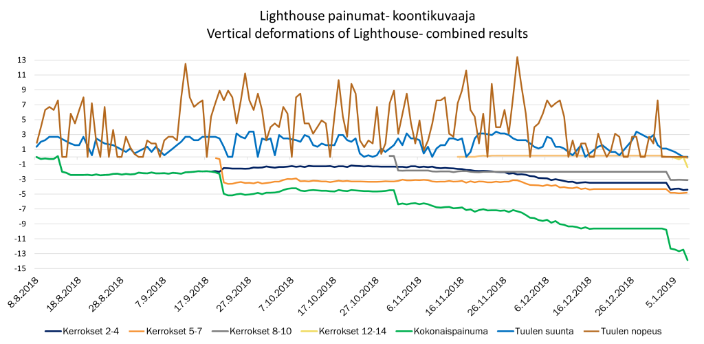 Kaavio 1.Ensimmäisen mittausjakson koontikuvaaja. Kokonaispainuman kuvaajasta (vihreä) voidaan havaita jännetankojen kiristystapahtumat äkillisinä painuman lisääntymisinä. Kaaviossa on yksi kuvaaja tuuliolosuhteille, joiden vaikutusta mittaustuloksiin ja niiden tarkkuuteen haluttiin selvittää.