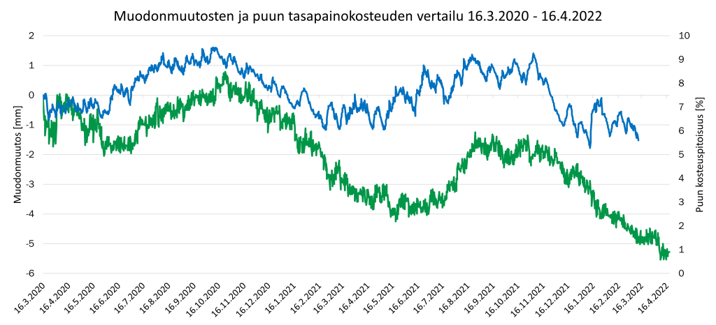 Kaavio 3. Kaaviossa vihreä kuvaaja osoittaa puurakenteen muodonmuutokset 16.3.2020 -16.4.2022 väliseltä ajalta ja sininen puun tasapainokosteuden. |