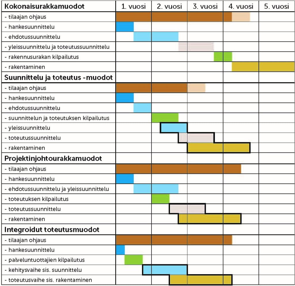 Rakennushankkeen läpiviennin periaate erilaisin toteutusmuodoin sekä osapuolia integroiva vaiheistus (musta rajaus)