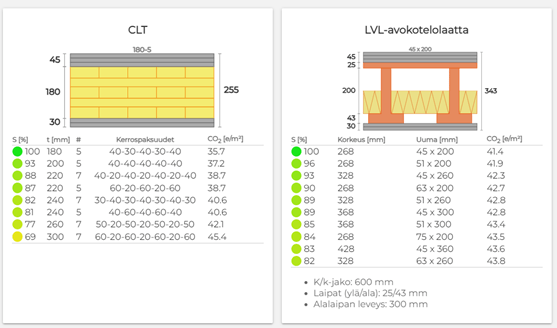 Floor Design -työkalun keskeisenä ominaisuutena on hiilijalanjäljen laskenta erityyppisille välipohjan rakennevaihtoehdoille ja näiden läpinäkyvä vertailu pintakerrokset huomioiden. Työkalu antaa hiilijalanjäljen mukaan optimoidut, suunnitteluvaatimukset täyttävät CLT- ja LVL-ripalaattarakenteet, sekä vertailukohteena taulukkomitoitetun ontelolaattaratkaisun käyttäjän antamiin lähtötietoihin perustuen.