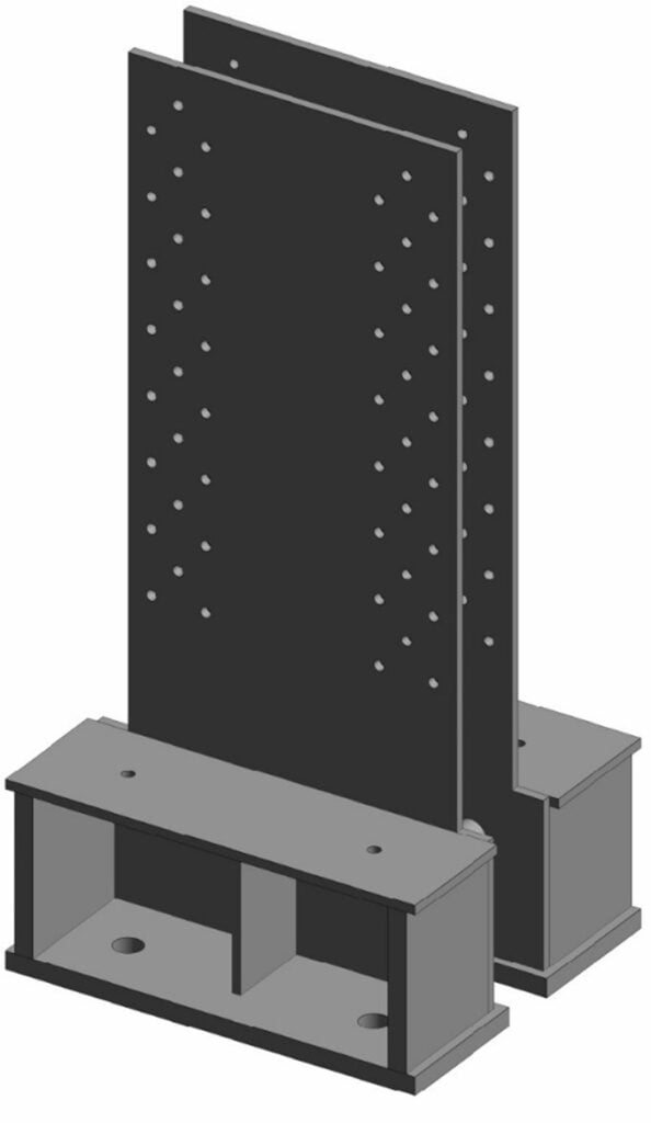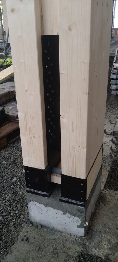 Kuva 11: Pilarikenkä on 2 osainen ja se kiinnitetään työmaalla ruuvaamalla liimapuupilarin alapäähän. Oikealla puolella näkyy myös pilarikengän sisään asennettu lankku (palosuojaus) sekä pilarikenkien väliin asennettu lankku, johon kootun pilarin välilankun alapää saadaan kiinnitettyä. (Insinööritoimisto Kantelinen Oy; Arto Haaranen).