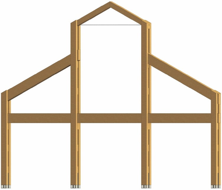 Kuva 4: Joensuun Kauppahallin liimapuukehä. Kehässä on 8 osittain jäykkää puu-puu-liitosta primääripalkkien ja koottujen pilarien välillä. Pilarin liitos perustukseen (4 kpl) on analysoitu täysin jäykkänä. Ylemmän katon liitokset (3 kpl) on analysoitu täysin nivelinä. (Insinööritoimisto Kantelinen Oy; Arto Haaranen)