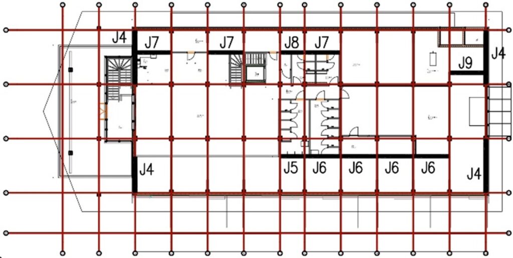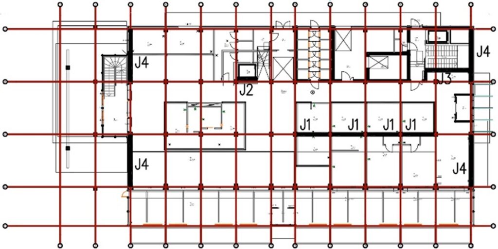 Kuva 5: Pituussuuntaan jäykistävät seinärakenteet ensimmäisessä kerroksessa: J1=Havuvaneripintainen puurankaseinä, J2=hissikuilun betoniharkkoseinä 150mm, J3=porrashuoneen betoniharkkoseinä 200 mm, J4=kipsilevypintainen ulkoseinäelementti, (Insinööritoimisto Kantelinen Oy; Arto Haaranen).