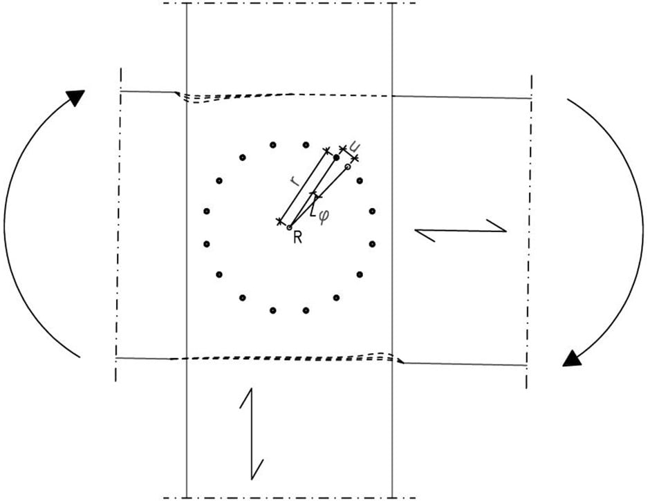 Kuva 7: Osittain jäykän liitoksen yksinkertaistettu toimintamalli. Loviliitoksen kiertojäykkyys muodostuu ympyräkehälle asennettujen ruuvien leikkauskestävyydestä sekä palkin ylä- ja alapinnan syytä vastaan kohtisuorasta puristuskestävyydestä. Alareunassa on lisäksi pystykuorman aiheuttama tukipaine. (Karelia AMK; Arto Haaranen).