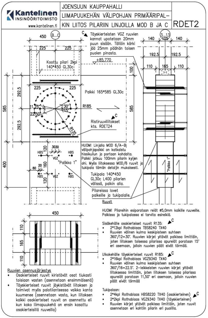 Liitokseen on asennettu ensin sisäkehälle 2 x 12 kpl leveäkantaisia osakierreruuveja (Rothoblaas TBS 8,0 x 240), jotka kiristävät lovetun osapilarin (140 x 450) tiukasti palkin (165×585) kylkeä vasten. Sisäkehän säde on 135mm, sisäkehän ruuvit toimivat 1-leikkeisinä ja näiden ruuvien kierteinen osa uppoaa kokonaan palkkiin, jolloin pilari kiristyy ruuvin sileän varren osalla vapaasti. Pilarin vastakkaisilla puolilla ruuvausrasteria on kierretty 15°, jolloin ruuvien kärjet limittyvät vapaasti palkin sisällä (kuva 9).