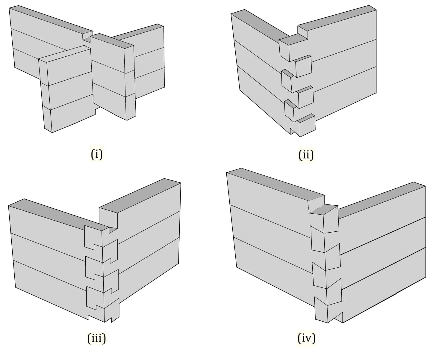 Neljä puuliitostyyppiä: i) kaksoislovi, ii) puolilovi, (iii) hammasnurkka, (iv) lohenpyrstö