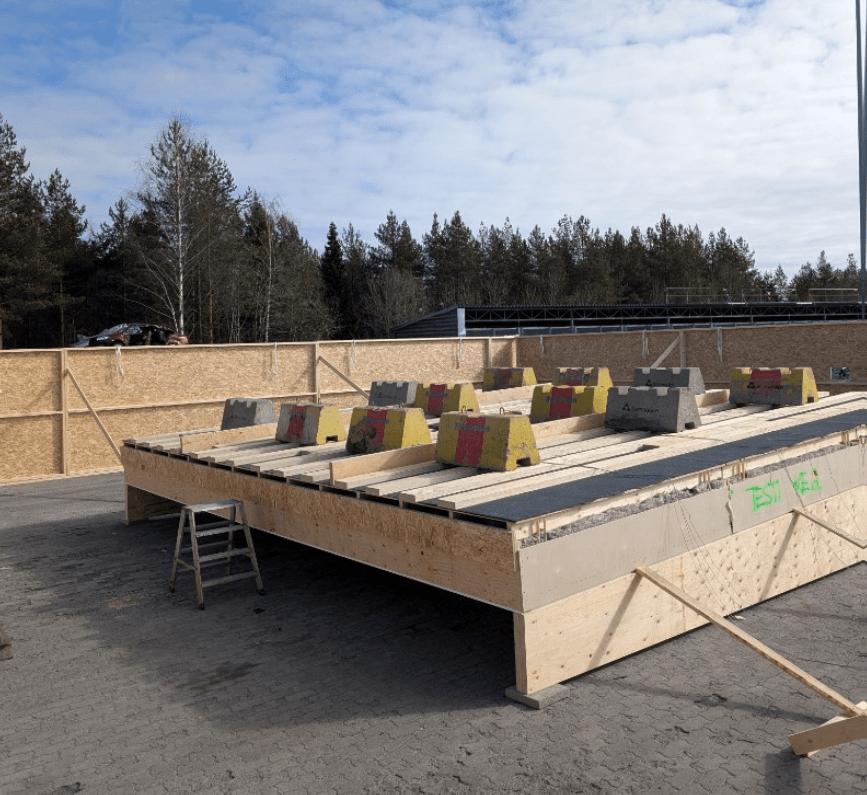 Koe toteutettiin kuormitettuna ja kuormitus luotiin LVL-palkein ja niiden päälle asetetuin tavallisin betoniporsain. Elementtien taipumaa seurattiin taipumamittauksen avulla kokeen aikana. Tuuletusrakoon puhallettiin teollisuustuulettimella ilmaa ja tällä luotiin luonnollista simuloiva ilmavirtaus tuuletusrakoon.