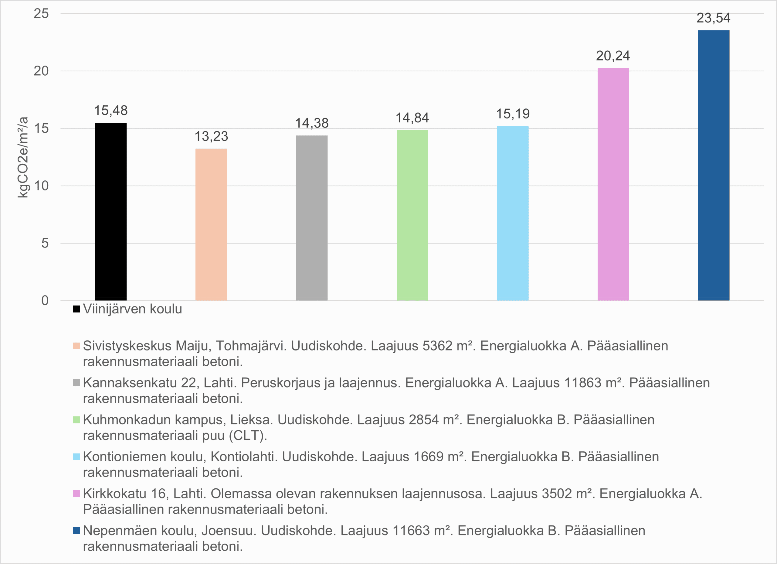 Jälkimmäistä kohdetta vertailtiin muihin viime vuosina arvioituihin oppilaitosrakennuksiin ja sen päästöt olivat alhaisimpien joukossa (kuva 4). Tulee kuitenkin huomioida, että laskentamenetelmät ja päästökertoimet muuttuvat usein, joten tulokset eivät ole täysin vertailukelpoisia. Kaikki muut kohteet kuin Viinijärven koulu on laskettu arviointimenetelmän (2019) vanhemmalla versiolla, joka antoi pääsääntöisesti matalampia tuloksia. Toisaalta esimerkiksi energian päästökertoimet ovat sittemmin laskeneet.