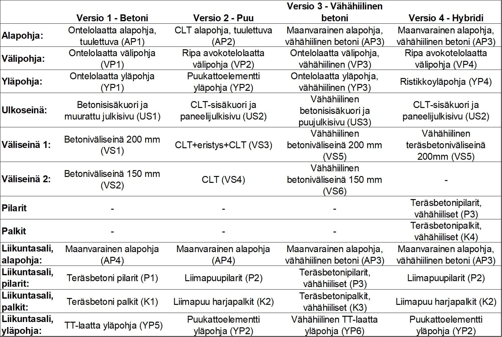 Ensimmäinen tarkasteltava kohde on koulurakennus, jonka osalta tarkasteltiin rungon toteutusvaihtoehtoja hankesuunnitteluvaiheessa päästöjen ja kustannusten osalta. Lähtötietona arviointiin oli hankesuunnitelman pohjalta tehty tilakaavio ja tilaohjelma, jonka mukainen laajuus on noin 5 400 kem². Hankkeessa vertailtiin neljää erilaista runkorakennetta, jotka olivat (1) betonirunkoinen, (2) massiivipuurunkoinen, (3) betonirunkoinen vähähiilisestä betonista ja (4) betonia ja puuta yhdistävä hybridirunkoinen. Versiot 1–3 ovat kantavin seinin toteutettuja, kun 4 on pilari-palkkirunkoinen. Versiot ja niissä käytetyt rakenteet ovat kuvattu tarkemmin kuvassa 1. [3, s. 16-17.]