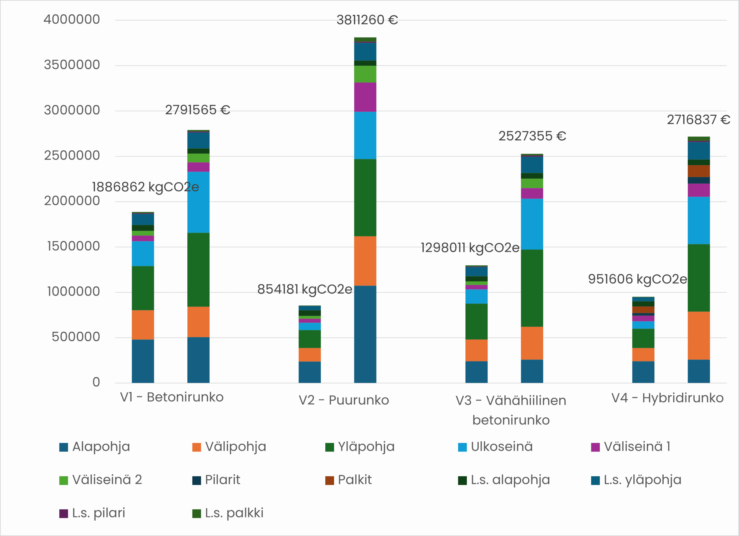 Elinkaariarvioinnin ja investointikustannuslaskelman perusteella havaitaan puurunkoisen rakennuksen olevan vaihtoehdoista vähähiilisin, mutta samalla kallein (kuva 2). Toisaalta puuta ja betonia yhdistävässä neljännessä versiossa päästöt ovat vain noin 11 % korkeammat, mutta sen kustannukset ovat lähes 29 % matalammat, kuin puurunkoisessa versiossa.
