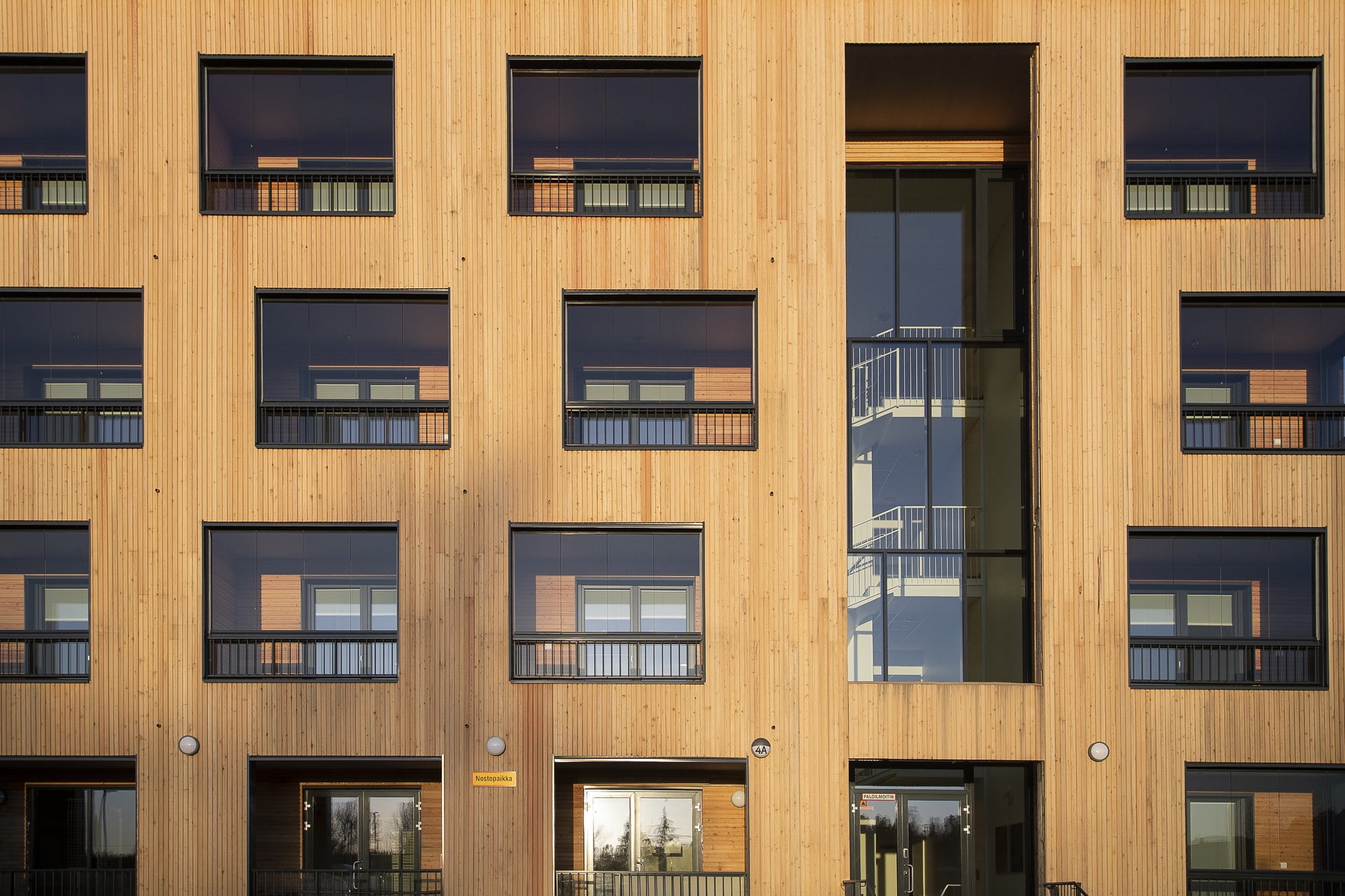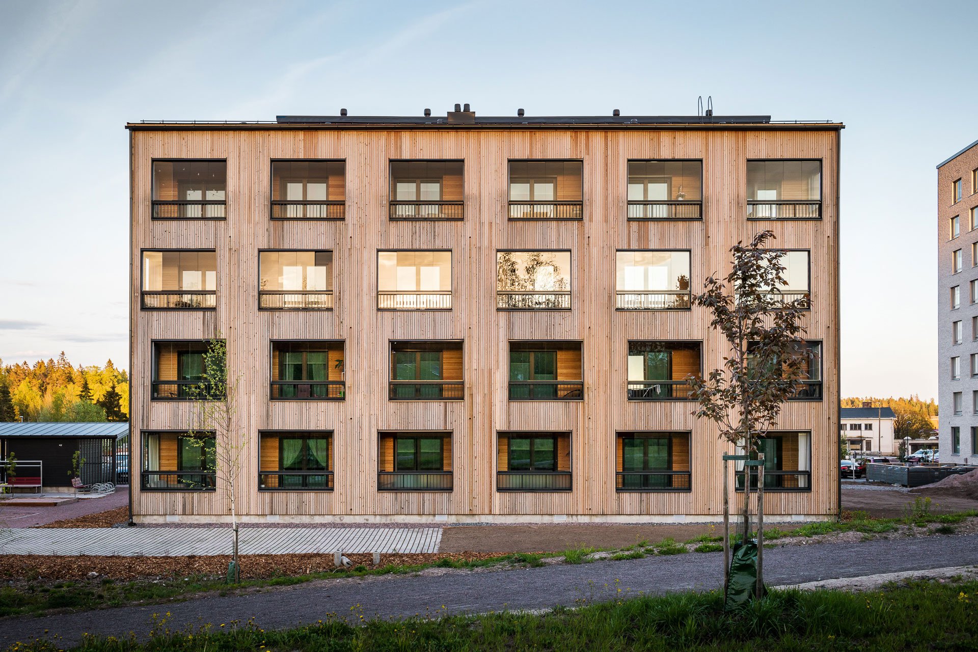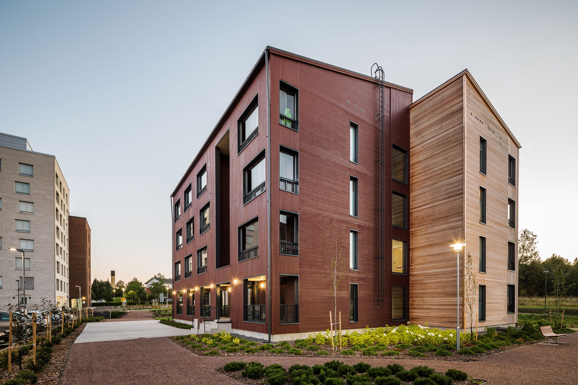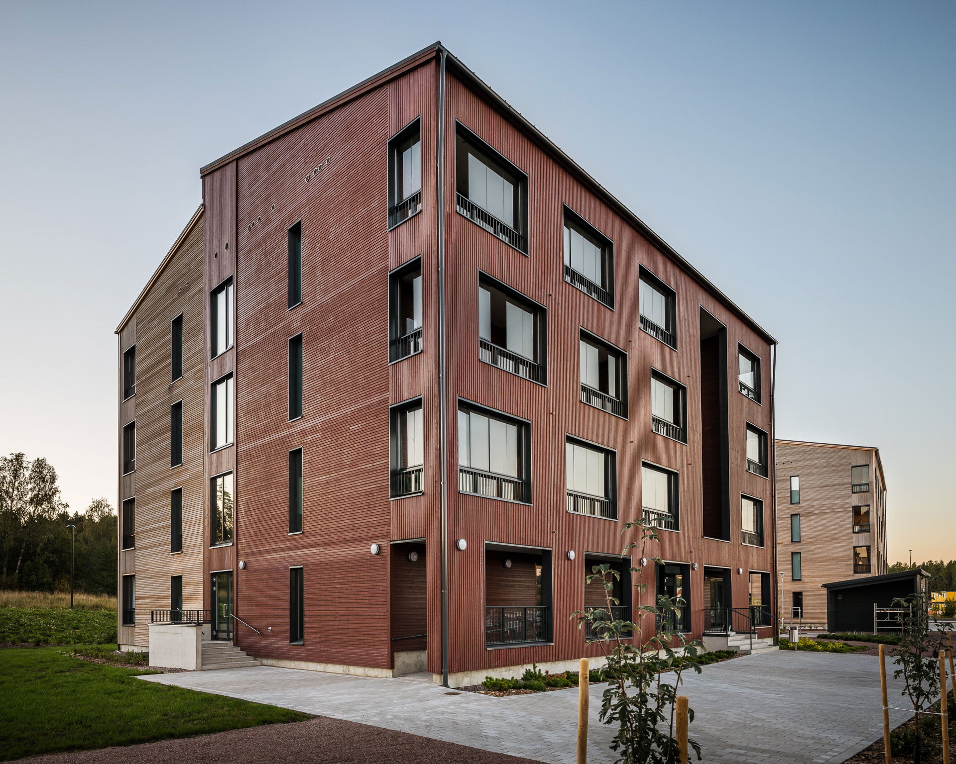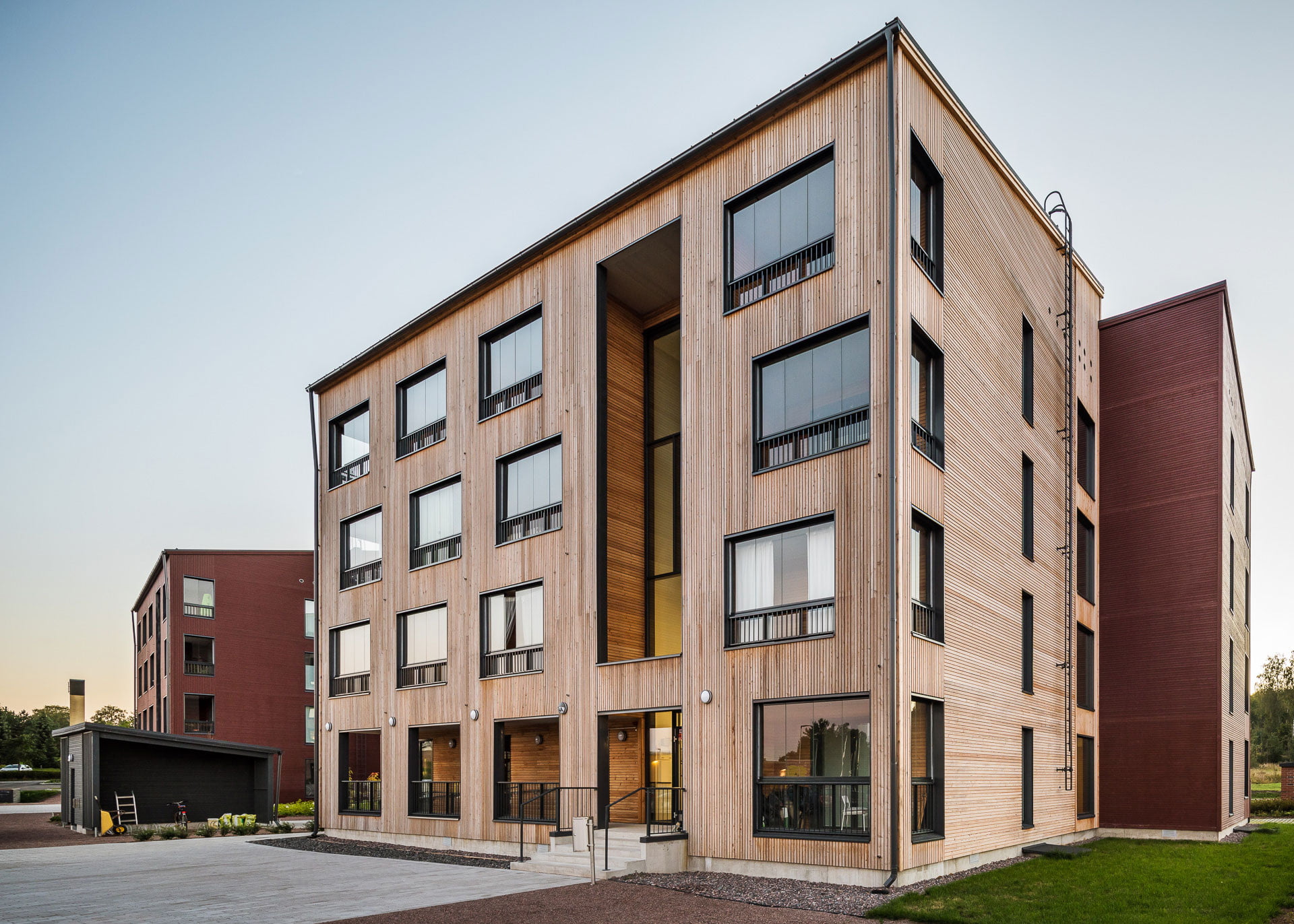Yhtenäistä arkkitehtonista ilmettä on haettu naapurin, viereisen tontin Tinantorinkuja 2:n 9 kerrosta korkean asuinkerrostalon kanssa, mikä näkyy muun muassa massoittelun rytmissä ja julkisivun värityksessä. Asuinkerrostalojen nivellettyä massaa korostamaan valittiin puulle kaksi eri julkisivukäsittelyä; naapurin tiilijulkisivujen sävyyn valittu tiilenpunainen peittomaalaus sekä luonnollisen sävyinen, harmaantuva lehtikuusi. Parvekevyöhykkeen julkisivuihin on luotu vaihtelua kääntämällä puupanelointi pystysuuntaiseksi ja vaihtelemalla aukoituksen rytmiä. Arkkitehtoniset elementit on pidetty pelkistettyinä ja määrältään hallittuina, jolloin kokonaisuus on ilmeeltään selkeä ja yhtenäinen.