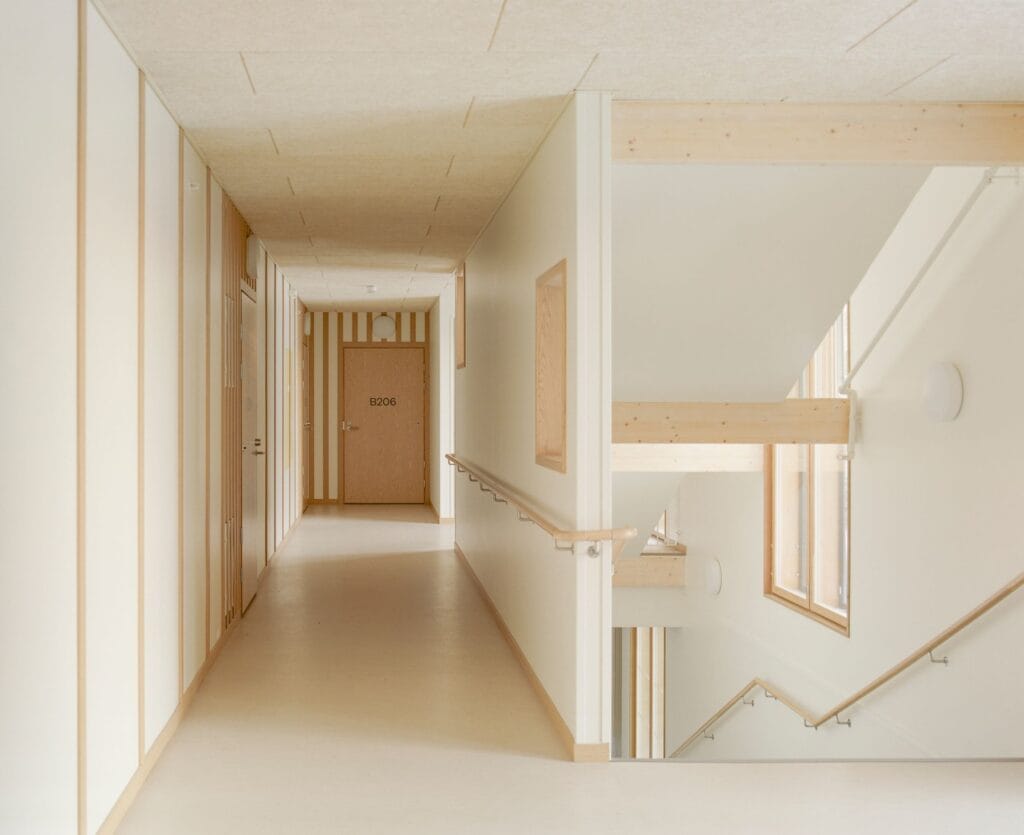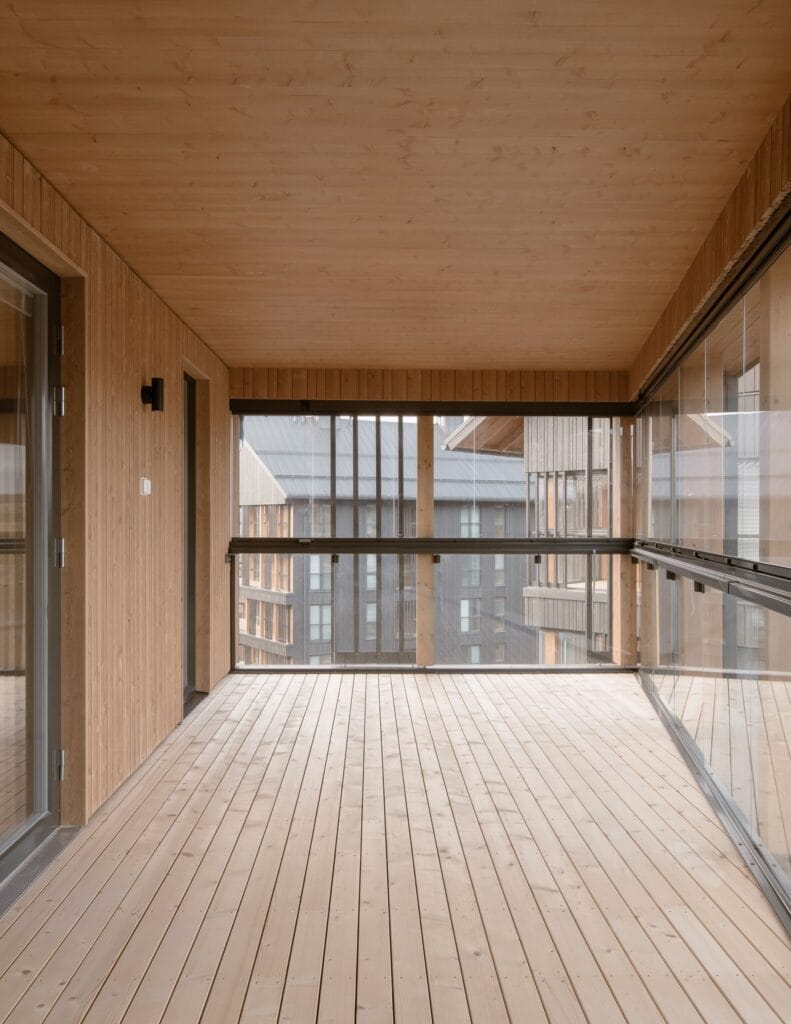 Kantavissa rakenteissa käytetty ristiinliimattu massiivipuu on 80 mm vahvaa, jolloin palosuojaus on toteutettu kohteessa pääasiassa suojaamalla CLT-seinät palokipsilevyillä. Puun näkyvyyttä ja luonnonläheistä tunnelmaa on kuitenkin korostettu: asuntojen kattopinnoissa ovat näkyvää CLT-pintaa, ja katosten sekä parvekkeiden pinnat ja rakenteet ovat niin ikään näkyvää puuta. Lisäksi kohteessa näyttävät kuultokäsitellyt puualumiini-ikkunat. Käyntiovet ovat puulasiovia.