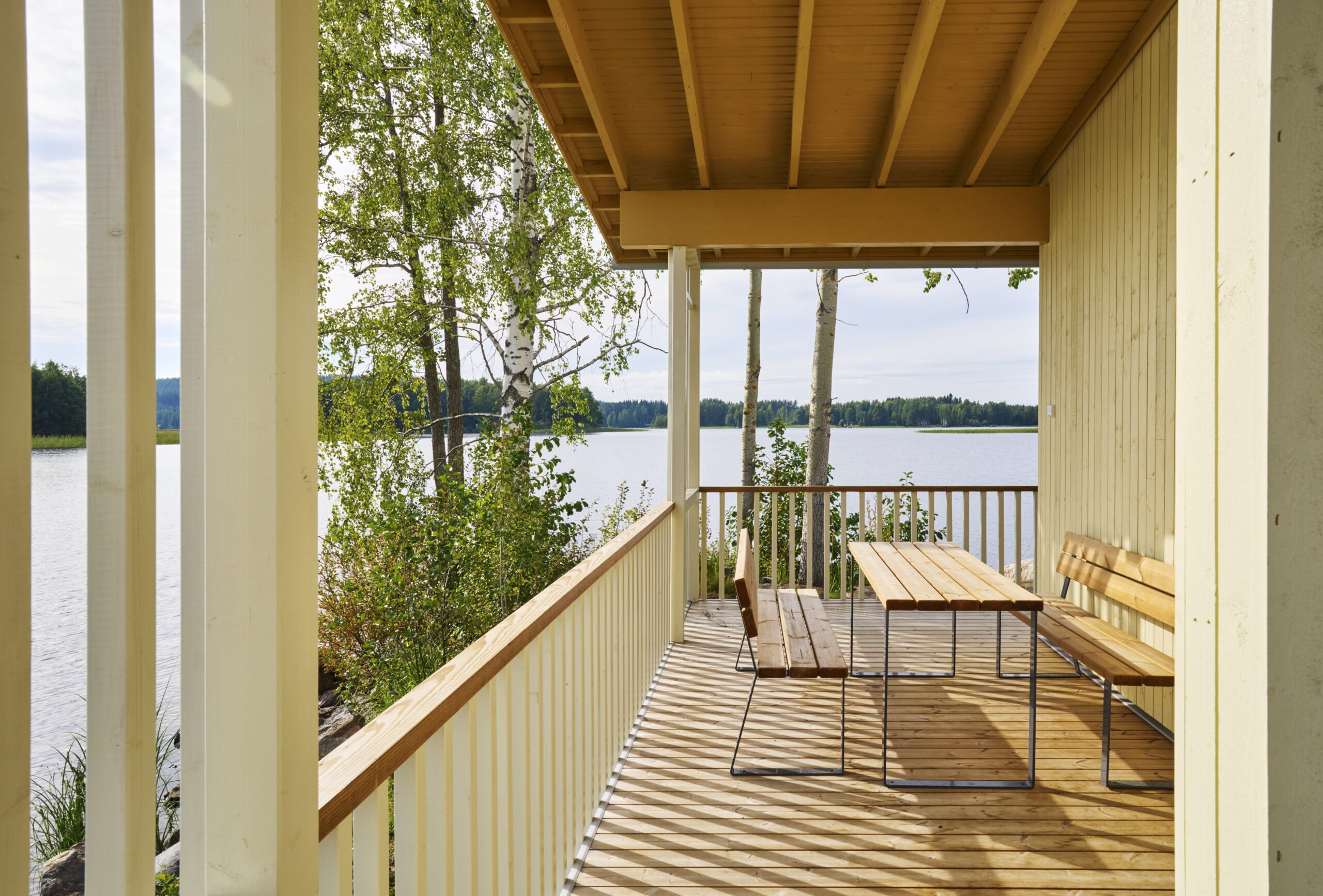 Rannan tuntumaan sijoitetussa saunassa pystyttiin tuomaan sisäpinnoille enemmän puuta ja makustelemaan miten taloyhtiösaunaan saadaan oikeaa rantasaunatunnelmaa. Kahdessa saunassa tunnelmaa luovat sisäpintojen tummat sävyt. Rantasaunassa maksimoitiin hyöty rannan läheisyydestä ja upeista maisemista niin, että pilariperustaista kevytrakenteista rakennusta kiertää jokaisella sivulla katettu terassi. Sen näkymiä rajaa valikoiden puusäleikkö ja profiililtaan kevyeksi suunniteltu katto. Kevyillä rimoituksilla saatiin herkkyyttä ja rytmiä kohteen suurehkoon pyöräkatokseen. Katos on pyritty häivyttämään rinnettä vasten kokoaan pienemmäksi.