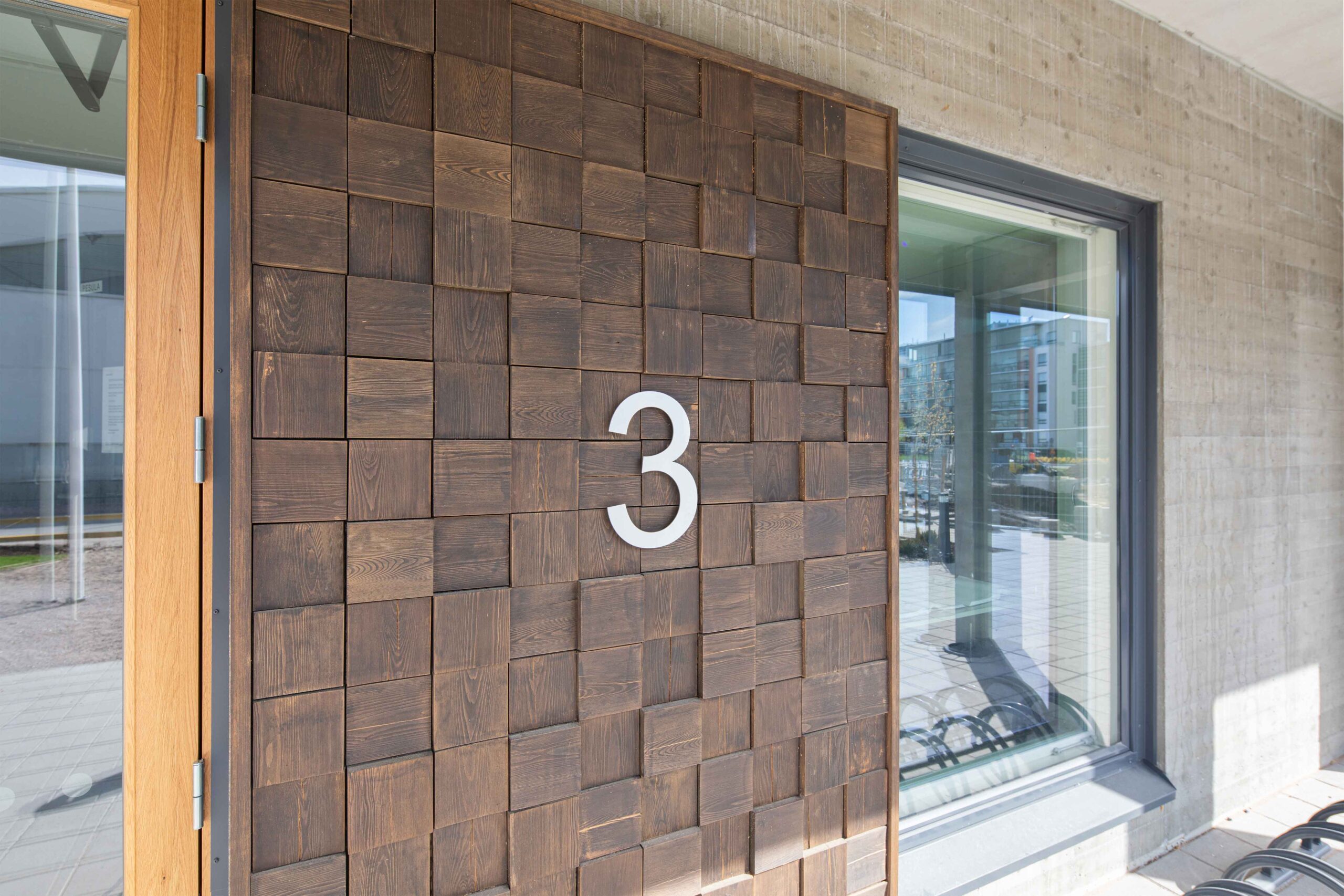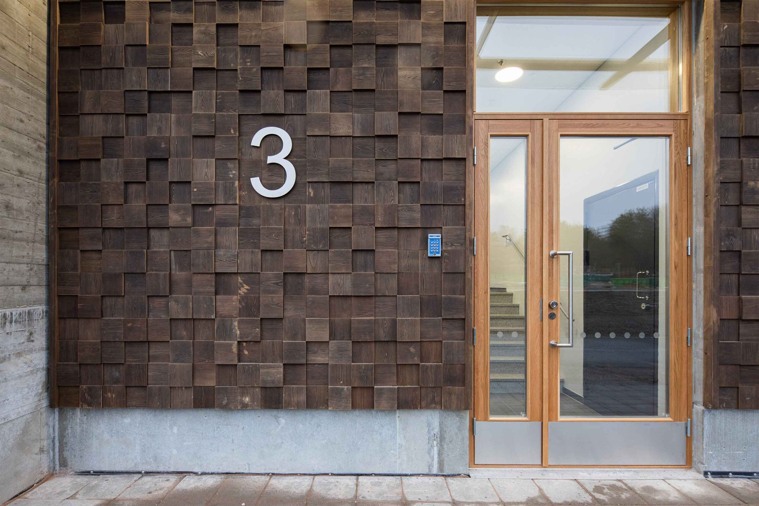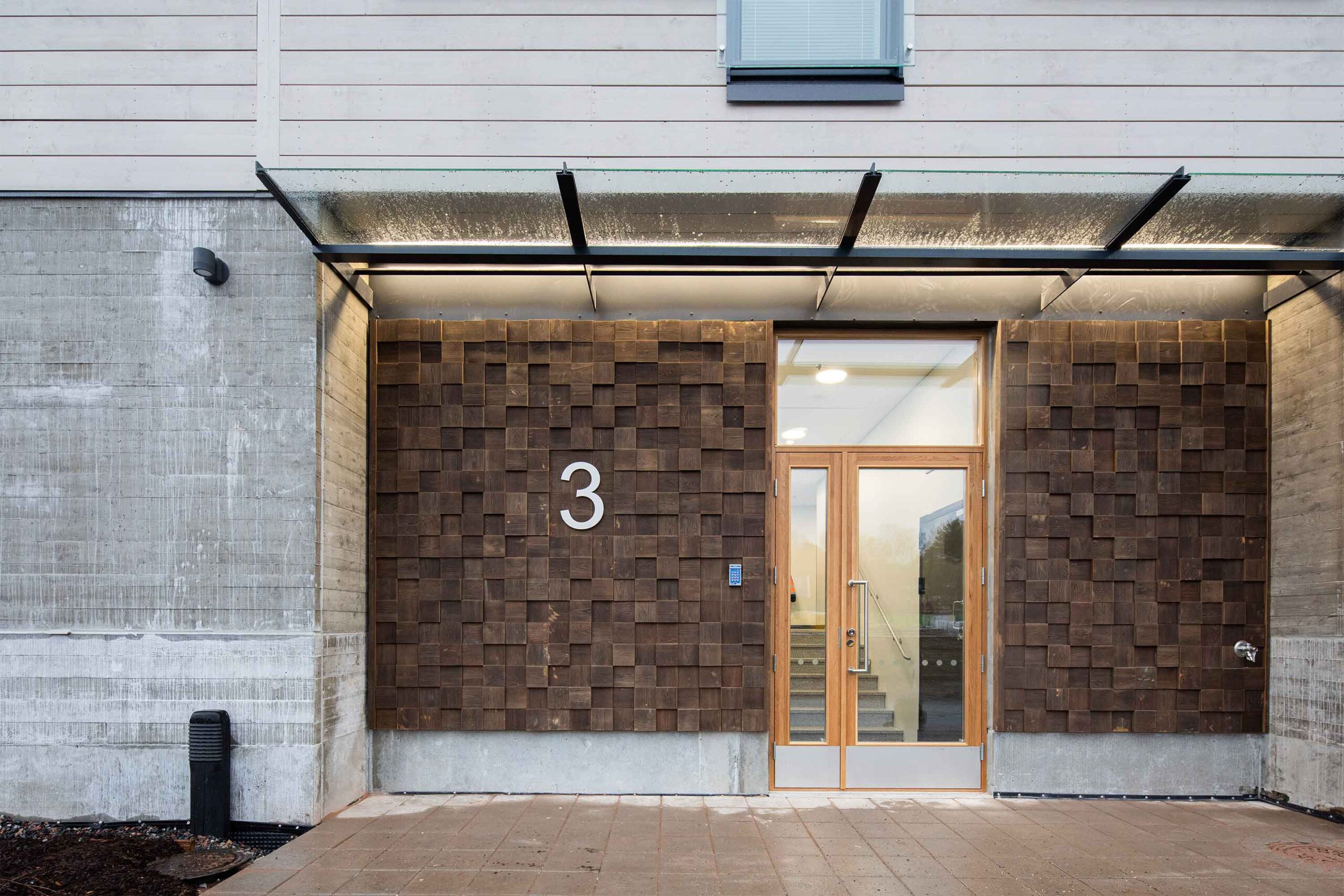 Ahtaassa kustannuspuitteessa onnistuttiin tuomaan pari puurakentamista ja puuosaamista esiintuovaa ja ilmettä pehmentävää yksityiskohtaa: puiset ulko-ovet ja sisäänkäyntien yhteyteen puukapuloista sommiteltu reliefiseinä. Rakentamismääräykset valitettavasti aiheuttivat sen, että puumateriaali jouduttiin sisätiloissa peittämään kipsilevyillä ja myös maantasossa yleensä asukasta on vastassa betoniseinä ja metallirakenteiset ovet.