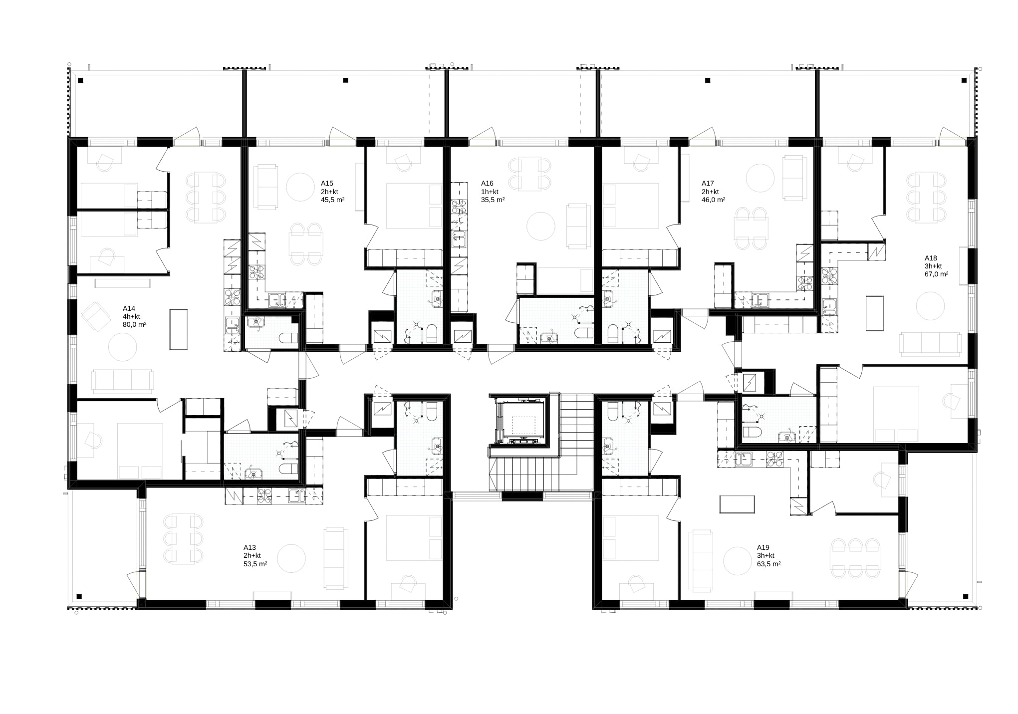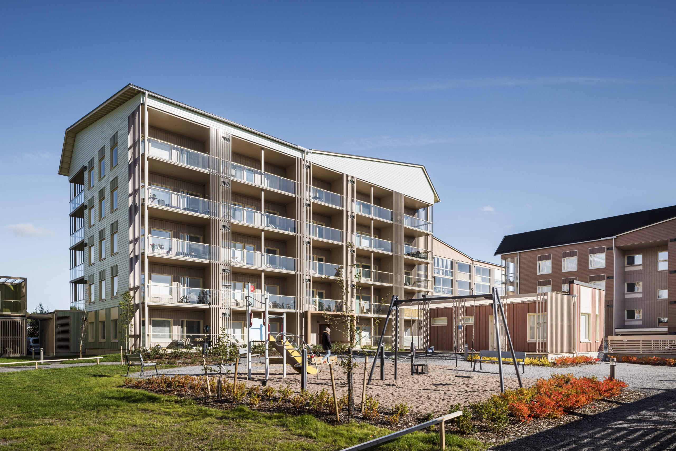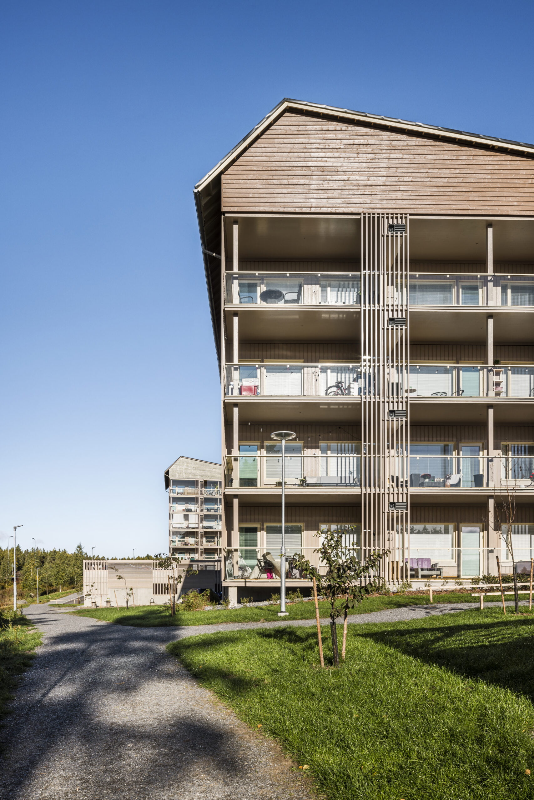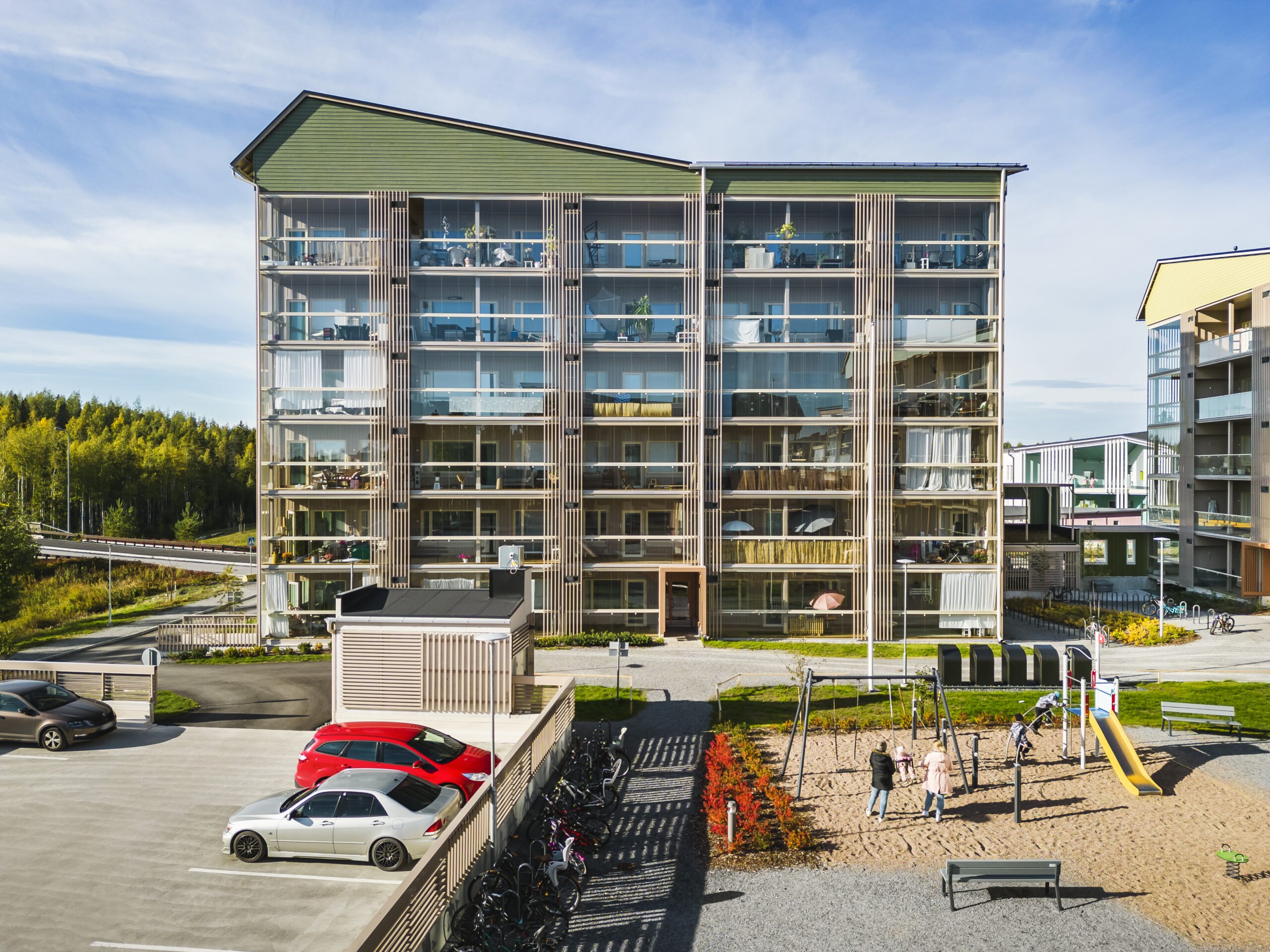 Asunnot ovat valoisia ja lähes kaikissa on tilava parveke. Puuta on jätetty näkyviin sisällä siellä, missä se on paloteknisesti ollut mahdollista – esimerkiksi puuportaana porrashuoneessa.