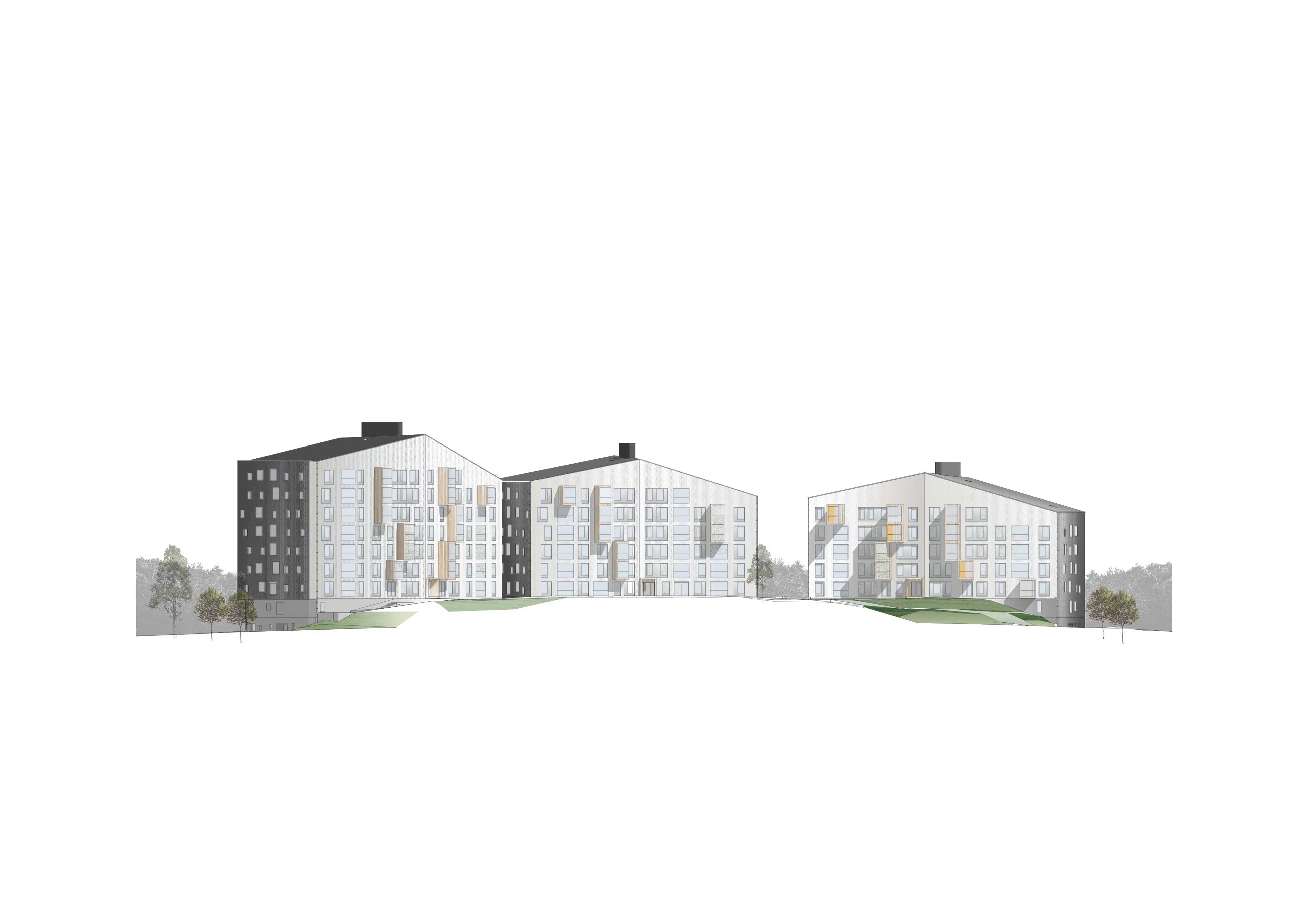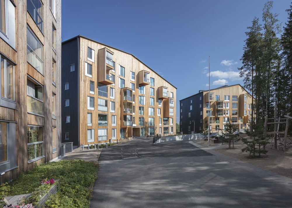 The Puukuokka Block is an energy-efficient and ecological trio of multistory wood-framed apartment buildings in the Jyväskylä suburb of Kuokkala. Finished in the spring of 2015, Puukuokka One was the first eight-story high wooden apartment building in Finland. Puukuokka Two followed in 2017, and with the completion of the Puukuokka Three in 2018, the entire Puukuokka Block is now ready. The Puukuokka complex offers homes for 186 households from single dwellers of all ages to families with children.
