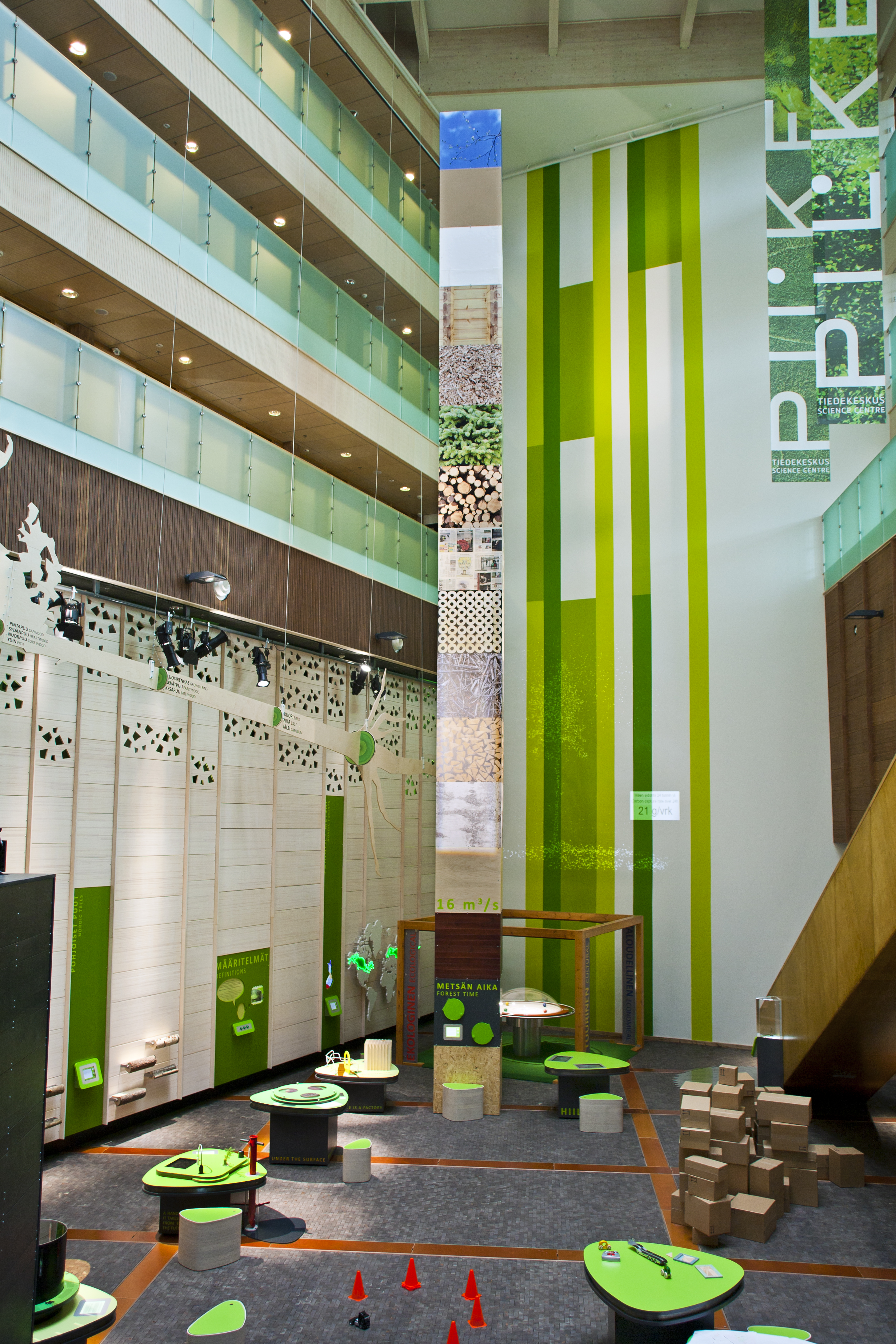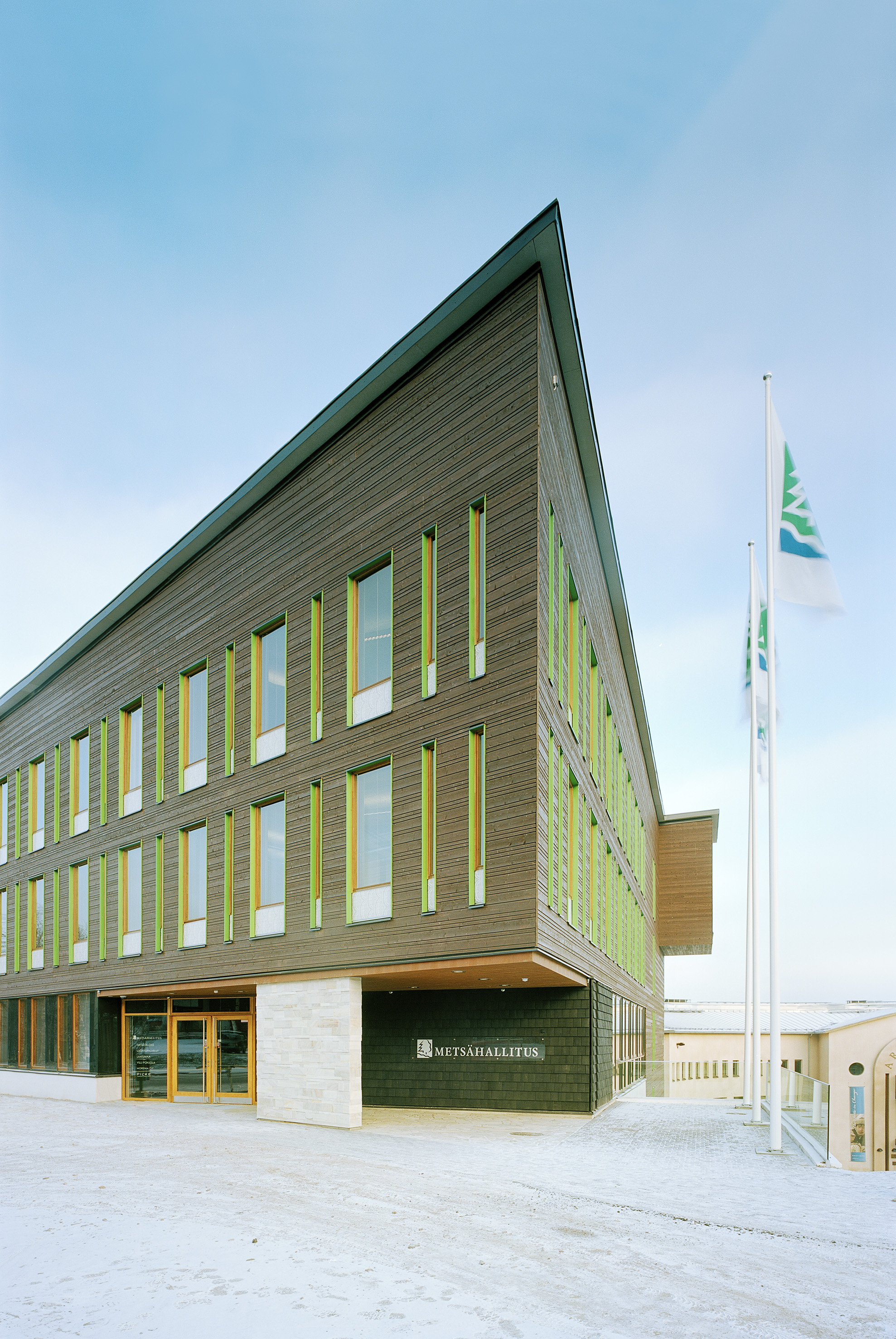 The Rovaniemi office of Metsähallitus has 135 employees and is home to the Pilke Science Centre, which introduces the sustainable use of northern forests. The building indicates the environmental policy of Metsähallitus. The carbon dioxide emissions of constructing Pilke are only one-third of the emissions of similar comparison buildings.