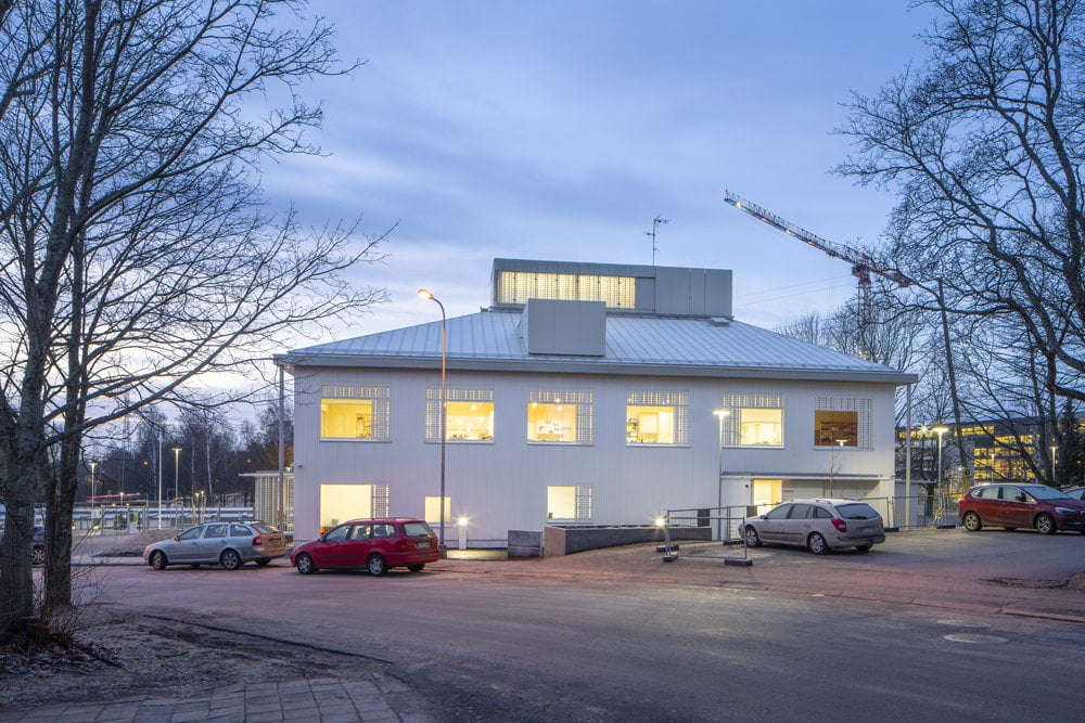 The building is a P2 fire class, wooden two-storey building. The load-bearing frame consists of CLT elements that will be left mostly visible on the inside, while the facades will be clad with vertical, painted panels of variable widths. Perforated window cladding supported by steel frames keeps out excess sunlight. The foundation and supporting walls are concrete, cast in place using a vertical board mould. Machine-seamed tin covers the roof, and the eaves and drainpipes are coated steel sheet.
