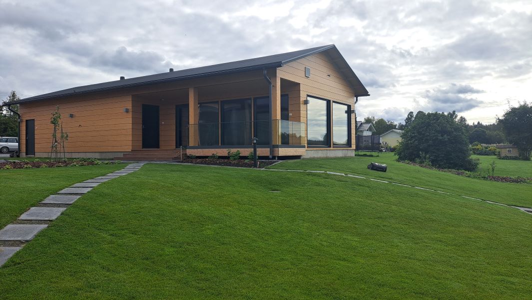 The choices of materials grew from the premise of building the entire house from the wood products, non-settling logs, and various panels and beams produced by the customer’s own company. In the interior, the logs and slatted surfaces are treated to be a lighter shade, with the darker hues of the panels adding depth and ambience. The colour scheme also complements the furniture relocated from the previous home, with the dark hues of the ceiling and kitchen enhancing the muted tones of wood and leather.