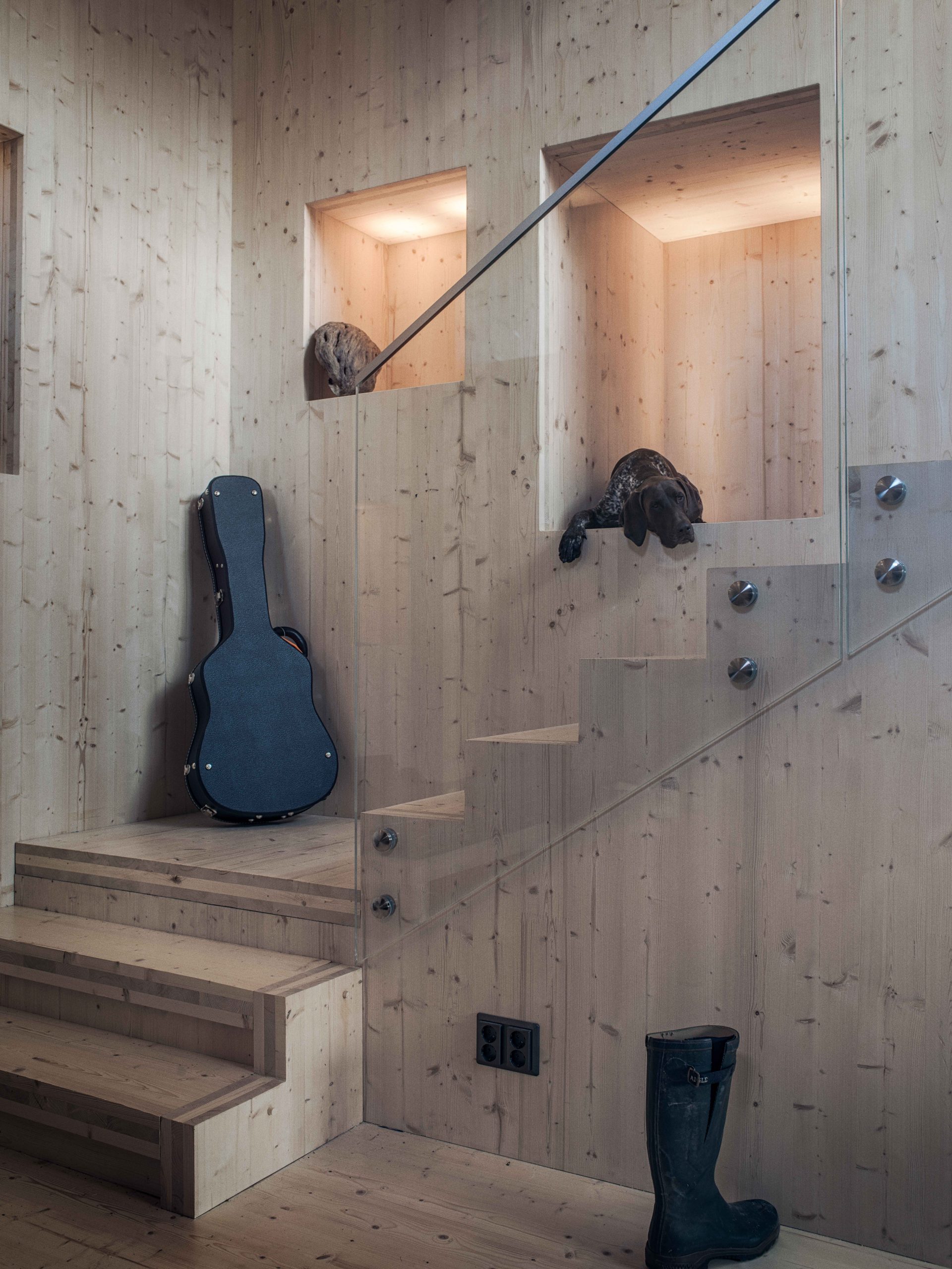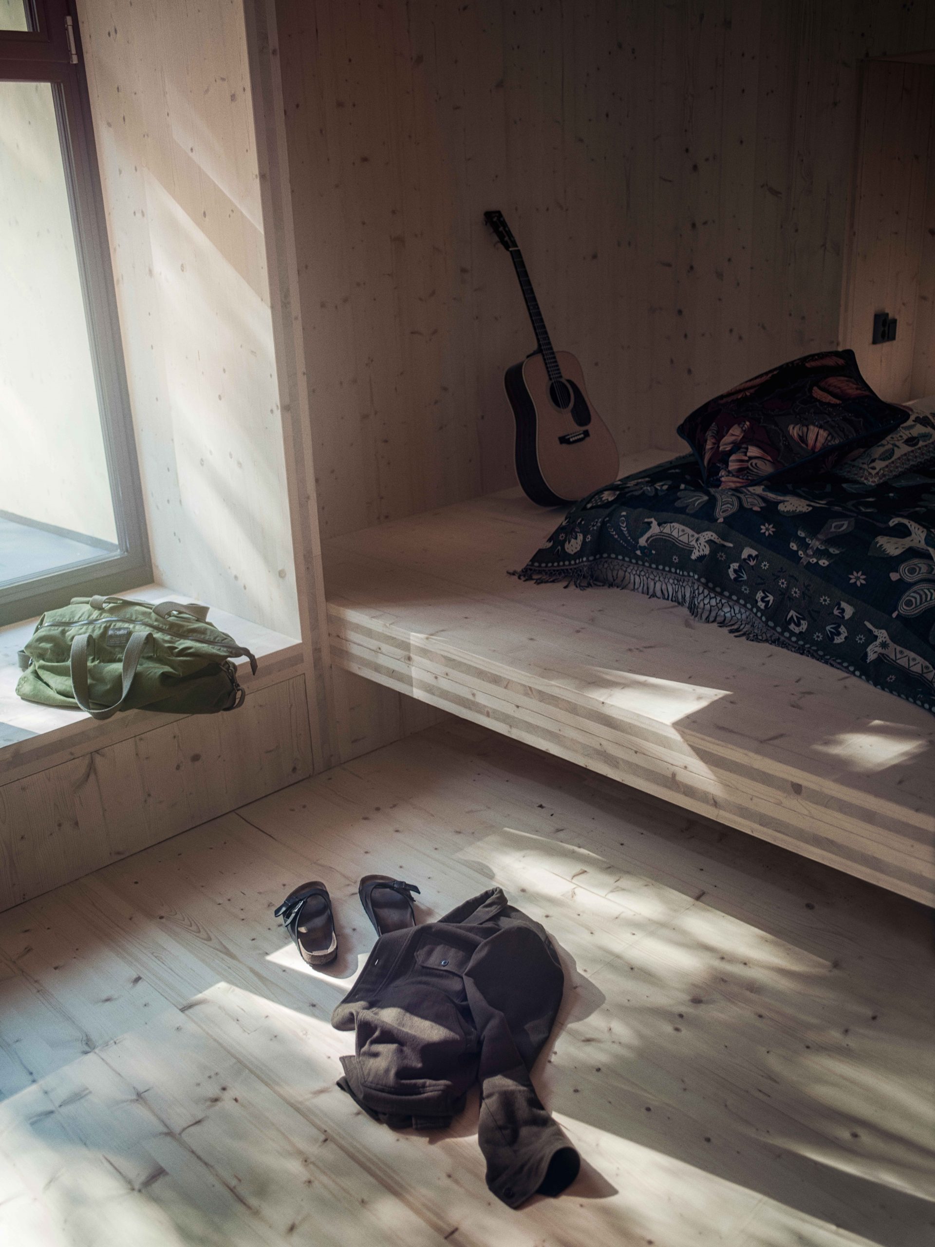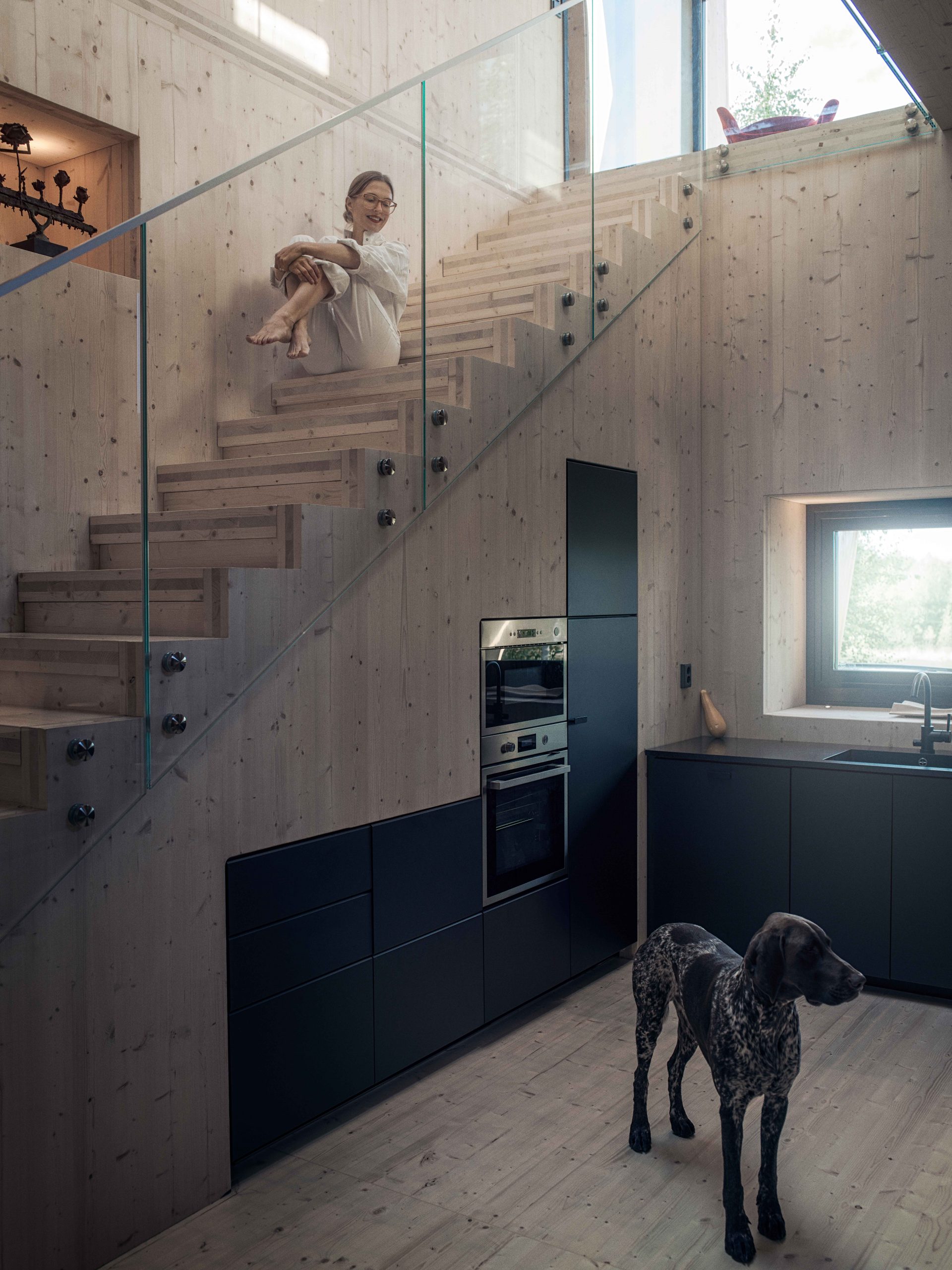 Die rechteckigen Wohnräume sind in einer vieleckigen dreidimensionalen Hülle verborgen. Die sehr genau geschnittenen CLT-Teile ermöglichen das Benutzen der fast rahmenlosen Fenster. Eins davon, das zehn Quadratmeter hohe „Himmelfenster” lässt einen auf das Weltall blicken und gibt ihm die Möglichkeit, das Wandern der Wolken, den Sternenhimmel und sogar mal die Polarlichter zu bewundern. Angetrieben von der Corona-Pandemie und von den Laufbränden Kaliforniens beschloss die Familie sich fest in Finnland anzusiedeln. So musste das Gebäude auch als Arbeitsplatz und sogar auch als Musikstudio dienen. Sowohl die Familie als auch die Planer des Hauses bemerkten, wie überraschend gut die Akustik in jenem Gebäude mit seinen Holzwänden ist.