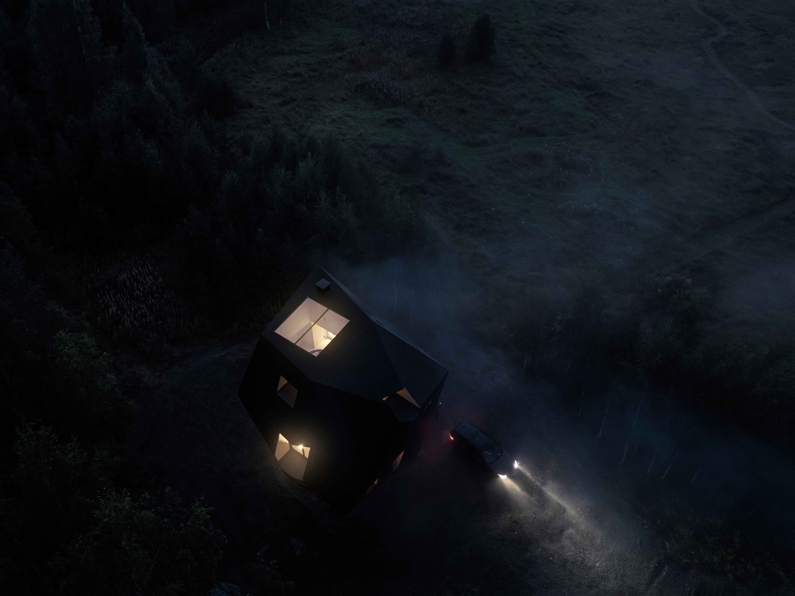 Ein finnischer, im kalifornischen Silicon Valley angesiedelter Technologieunternehmer wollte auf seinem Familienlandgut im nord-karelischen Kontiolahti ein Gästehaus bauen. Das Resultat ähnelt einem vielkantigen, hochkant stehen gebliebenen Körper, d essen Funktion nicht leicht zu verstehen ist.