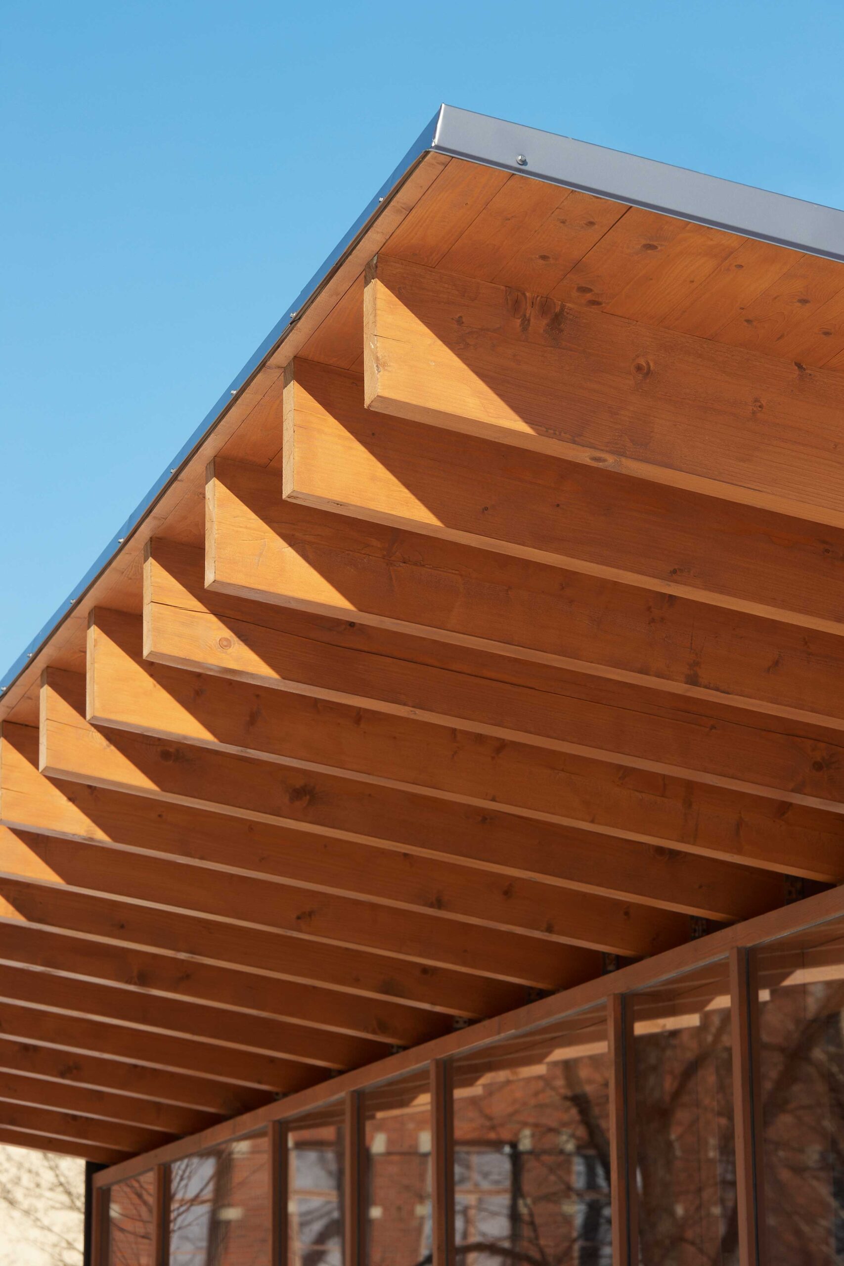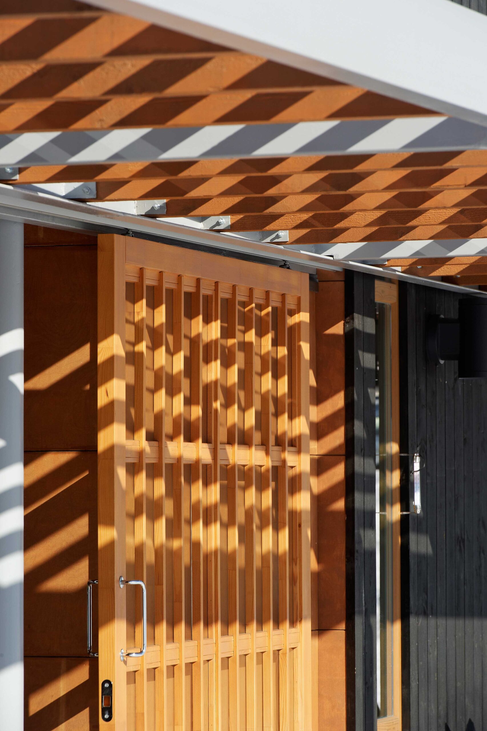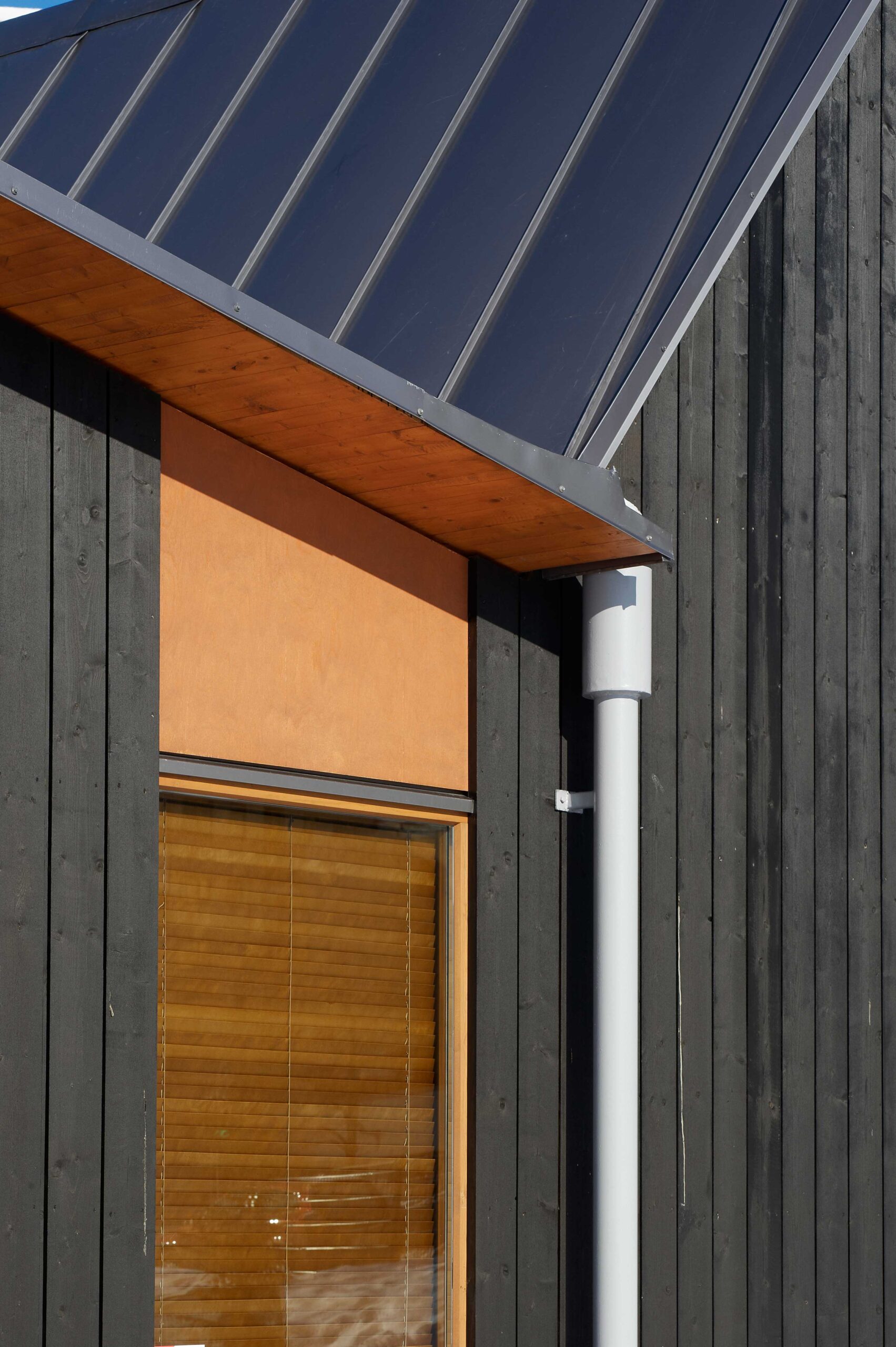 Rakennus on tehty puusta teräsrakenteilla ja kevytharkkomuureilla täydennettynä. Julkisivut on verhottu hienosahatuilla pystylaudoilla, joiden väleihin on jätetty avosaumat. Ulkopuolen puupinnat maalattiin suojaavin kuultovärein, ja sisällä seinäverhoukset, karmit ja kalusteet käsiteltiin puuvahoilla.