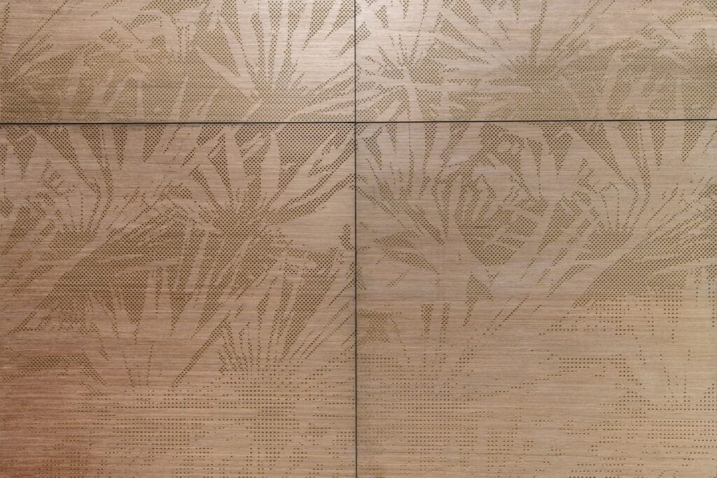 Suunnittelu toteutettiin asettamalla pyöreät rei’itykset kiinteitä kuvioita vasten viilutettujen vanerikerrosten päälle ja kaivertamalla palmunlehtien muodot, samalla kun saavutettiin halutut akustiset ominaisuudet.