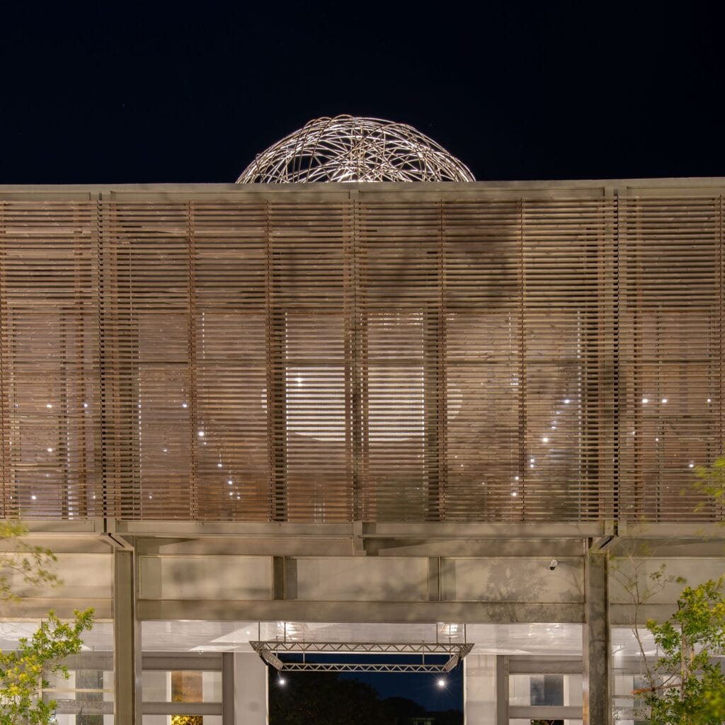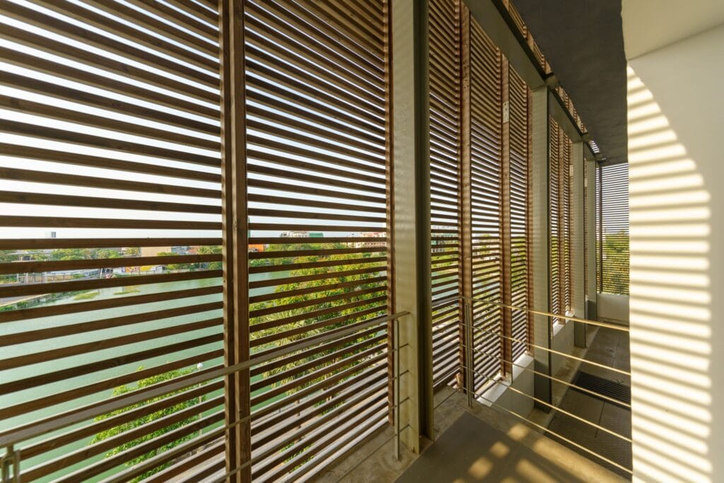 42 mm leveät Lunawood-profiilit on sijoitettu raoilla, jotka mahdollistavat näkymän jatkuvuuden horisonttiin. Ne valmistettiin huolellisesti ja asennettiin Intian asiantuntevan puuseppätiimin toimesta. Suojaus koostuu 3×3 metrin paneeleista, jotka asennetaan rakennuksen sisältä – ilman tarvetta ulkoiseen telineistöön asennukseen tai huoltoon.